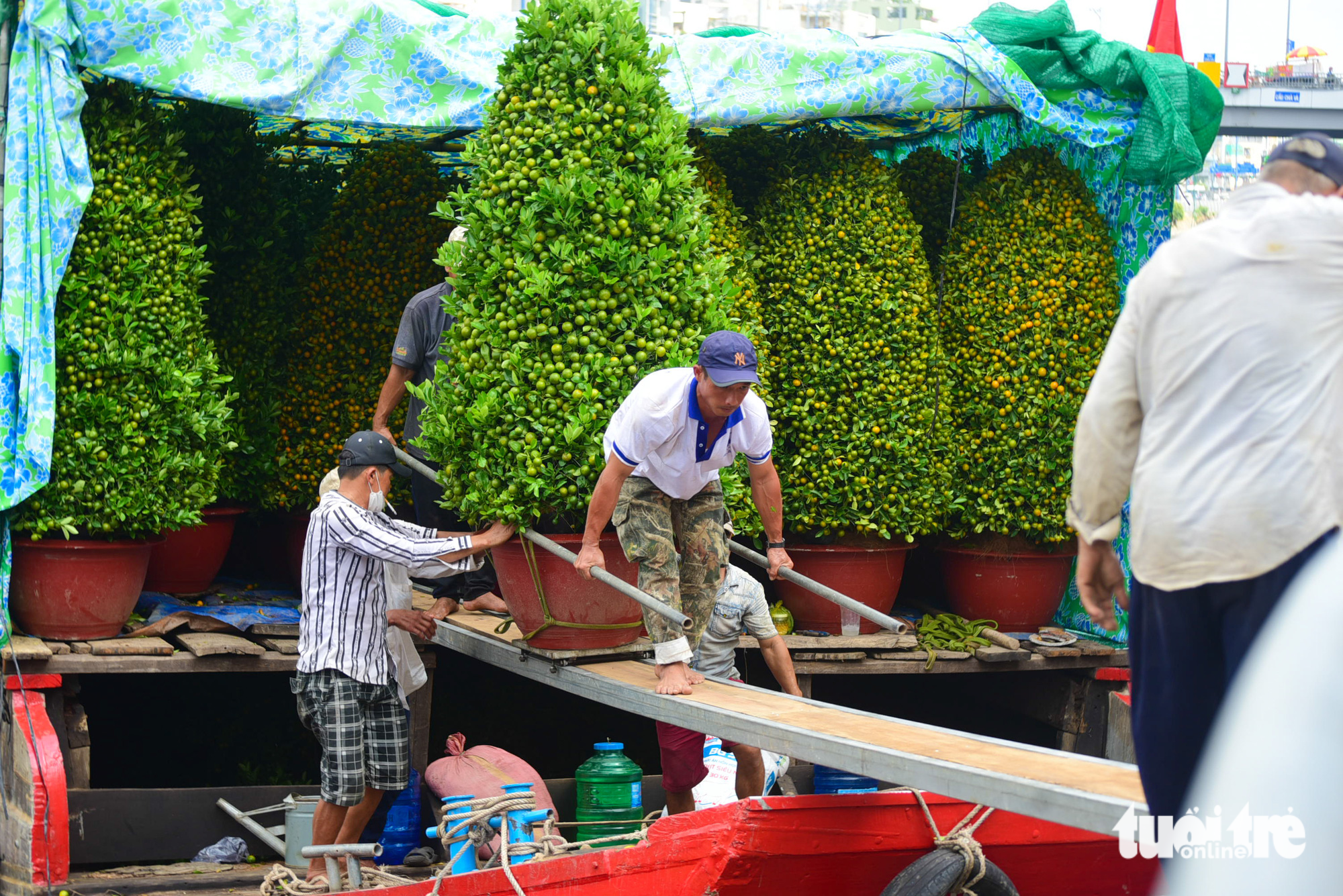 Để chở hoa từ miền Tây lên bến, nhà vườn đã phải nổ máy ghe trong khoảng 24 tiếng. Những chiếc ghe với tải trọng lớn nối đuôi nhau cập bờ kênh Tàu Hủ, mỗi ghe có cả chục nhân công khuân vác chậu hoa từ ghe lên bến.