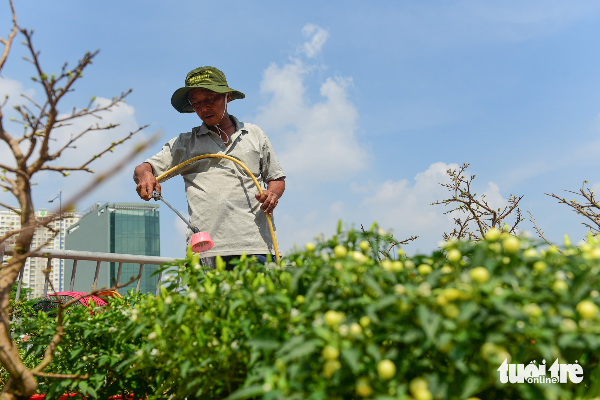 Chú Nguyễn Thái Bửu (nhà vườn Bến Tre) cho biết chú mang 1.000 chậu các loại mai vàng, mai chiếu thủy, ớt - Ảnh: NGỌC PHƯỢNG