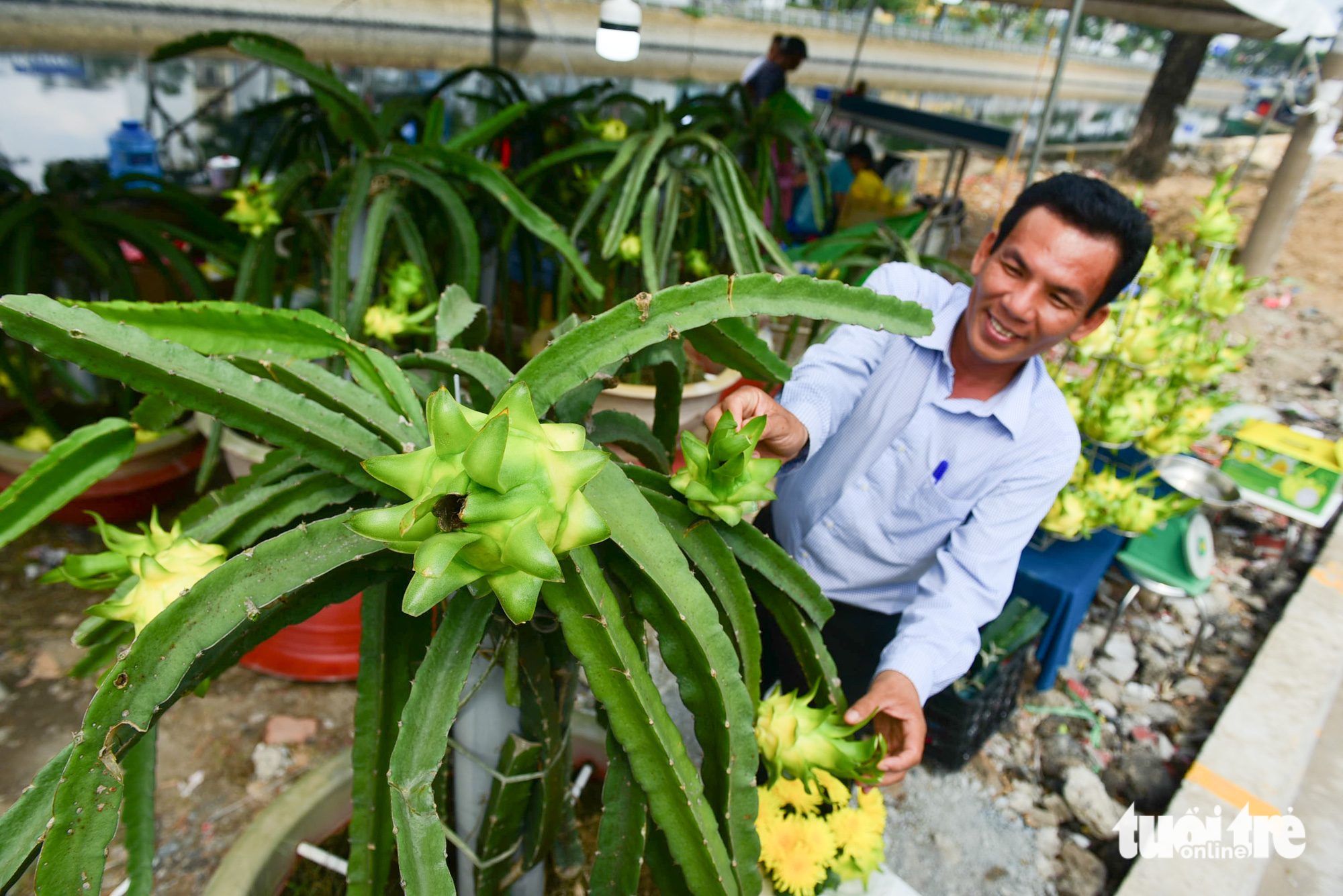 Anh Lâm Hoàng Chí (nhà vườn Vĩnh Long) sẵn sàng 300 chậu kiểng thanh long phục vụ bà con - Ảnh: NGỌC PHƯỢNG