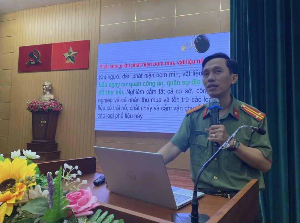 Trung tá Bùi Thái Đức phổ biến một số nội dung cơ bản về các điều, khoản quy định quản lý, sử dụng vũ khí, vật liệu nổ và công cụ hỗ trợ