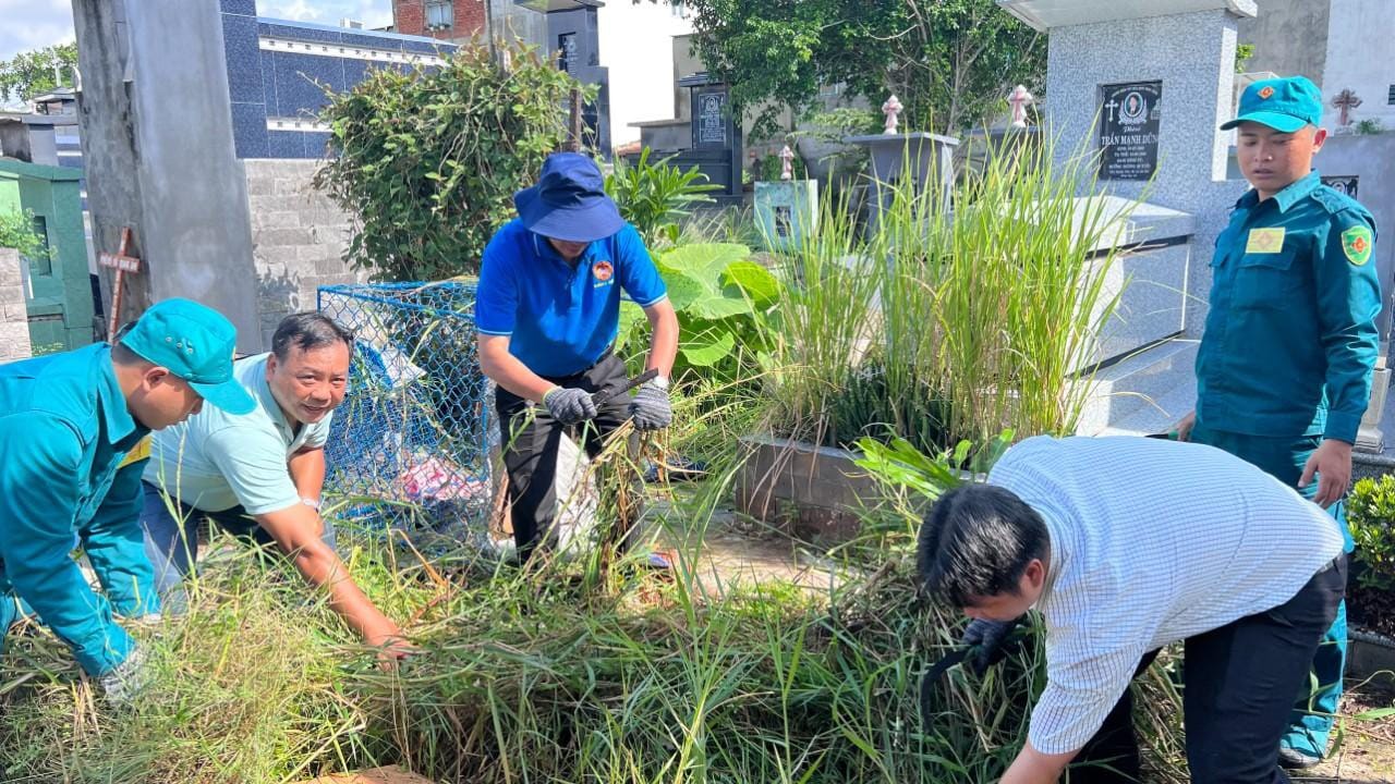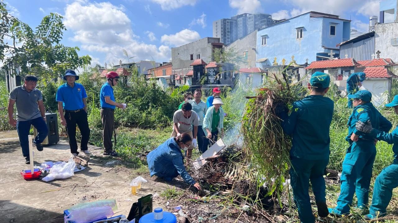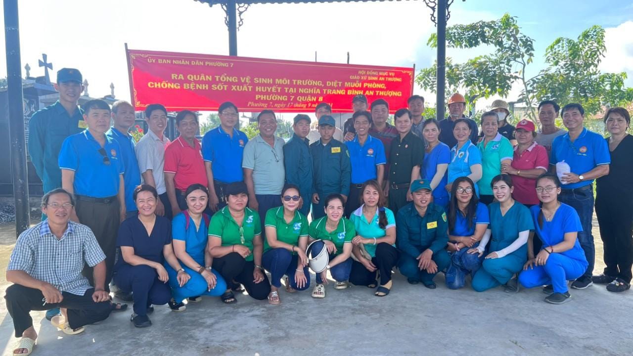 Sáng 17/9, Ủy ban nhân dân - Ủy ban Mặt trận Tổ quốc các đoàn thể Phường 7 phối hợp với Hội đồng mục vụ Giáo xứ Bình An Thượng tổ chức tổng vệ sinh môi trường tại khu vực nghĩa trang Bình An Thượng là điểm có nguy cơ cao phát sinh lăng quăng gây dịch bệnh sốt xuất huyết.