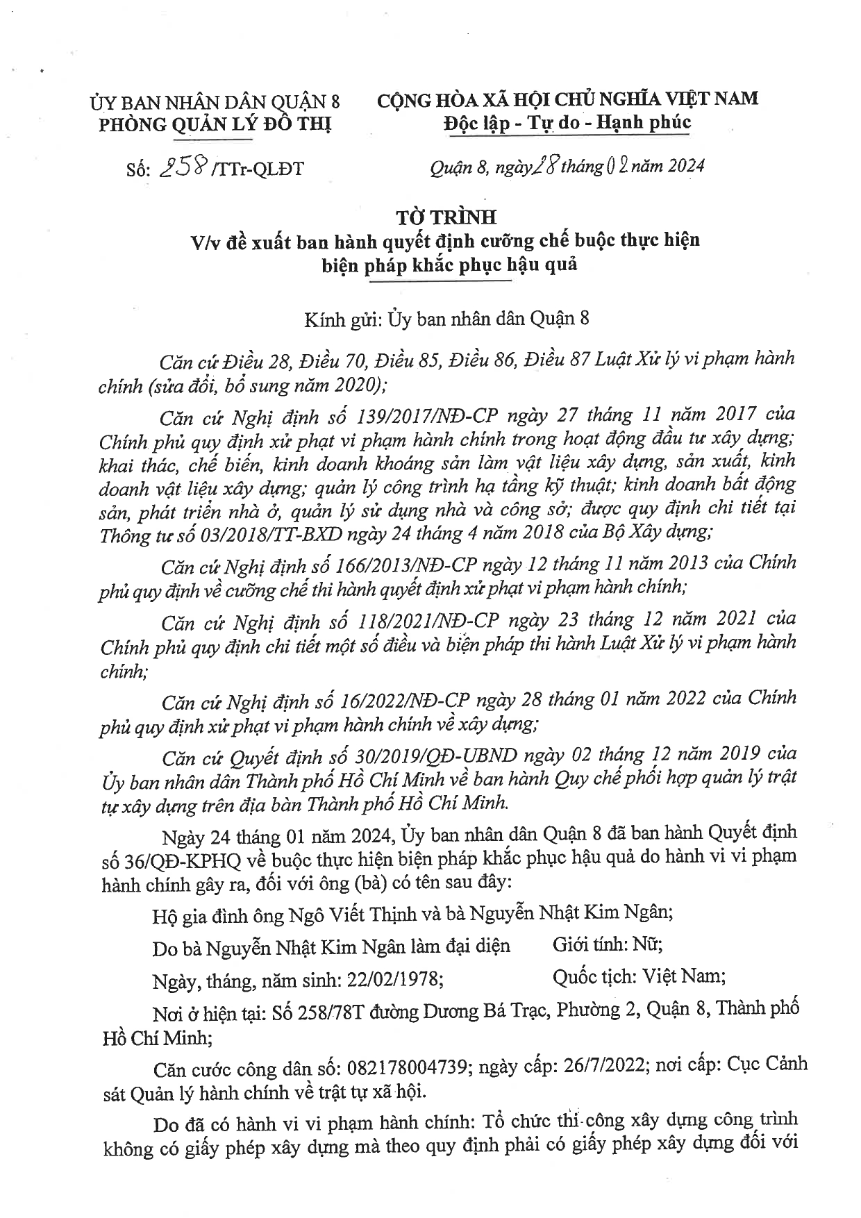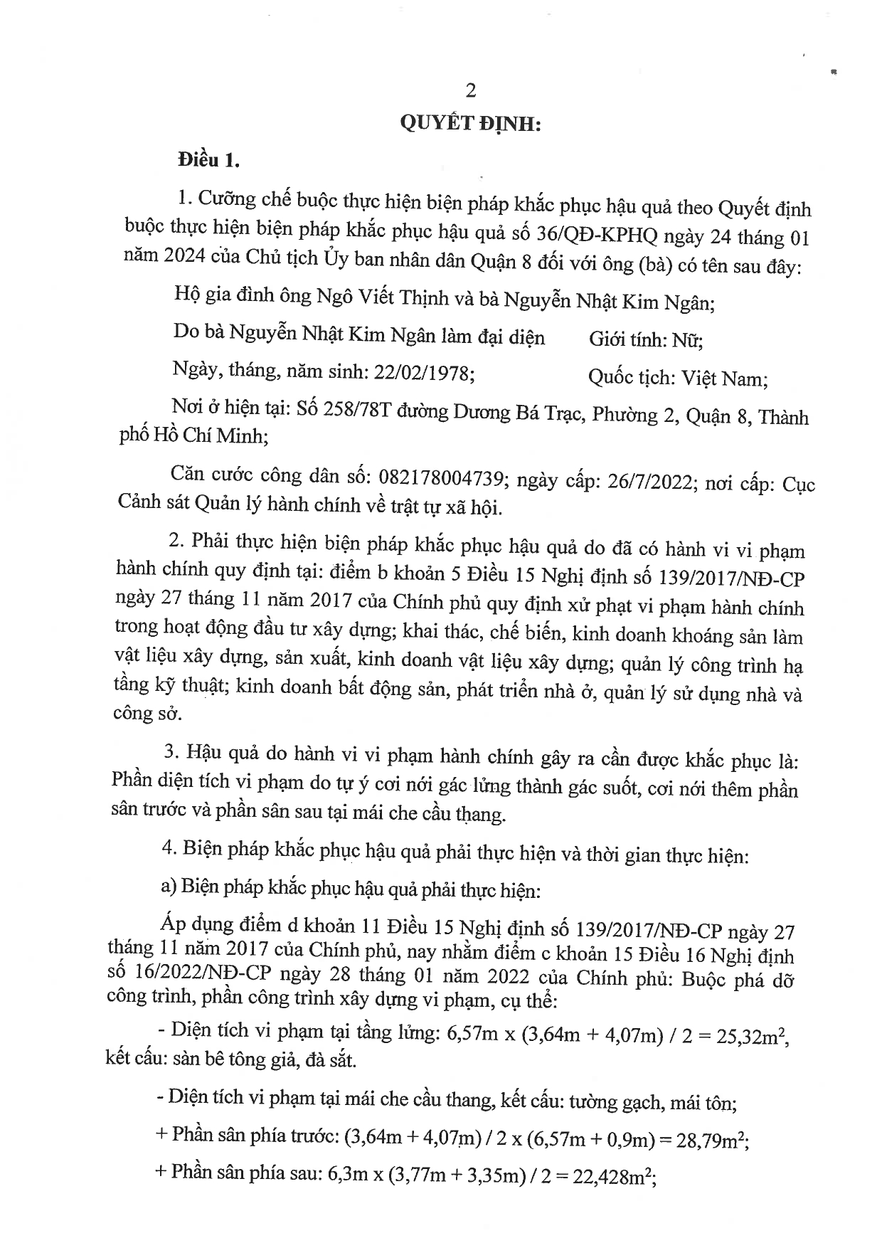Quyết định 74/QĐ-CCXP ngày 04 tháng 3 năm 2024 của Ủy ban nhân Quận 8 Về việc Cưỡng chế buộc thực hiện biện pháp khắc phục hậu quả
