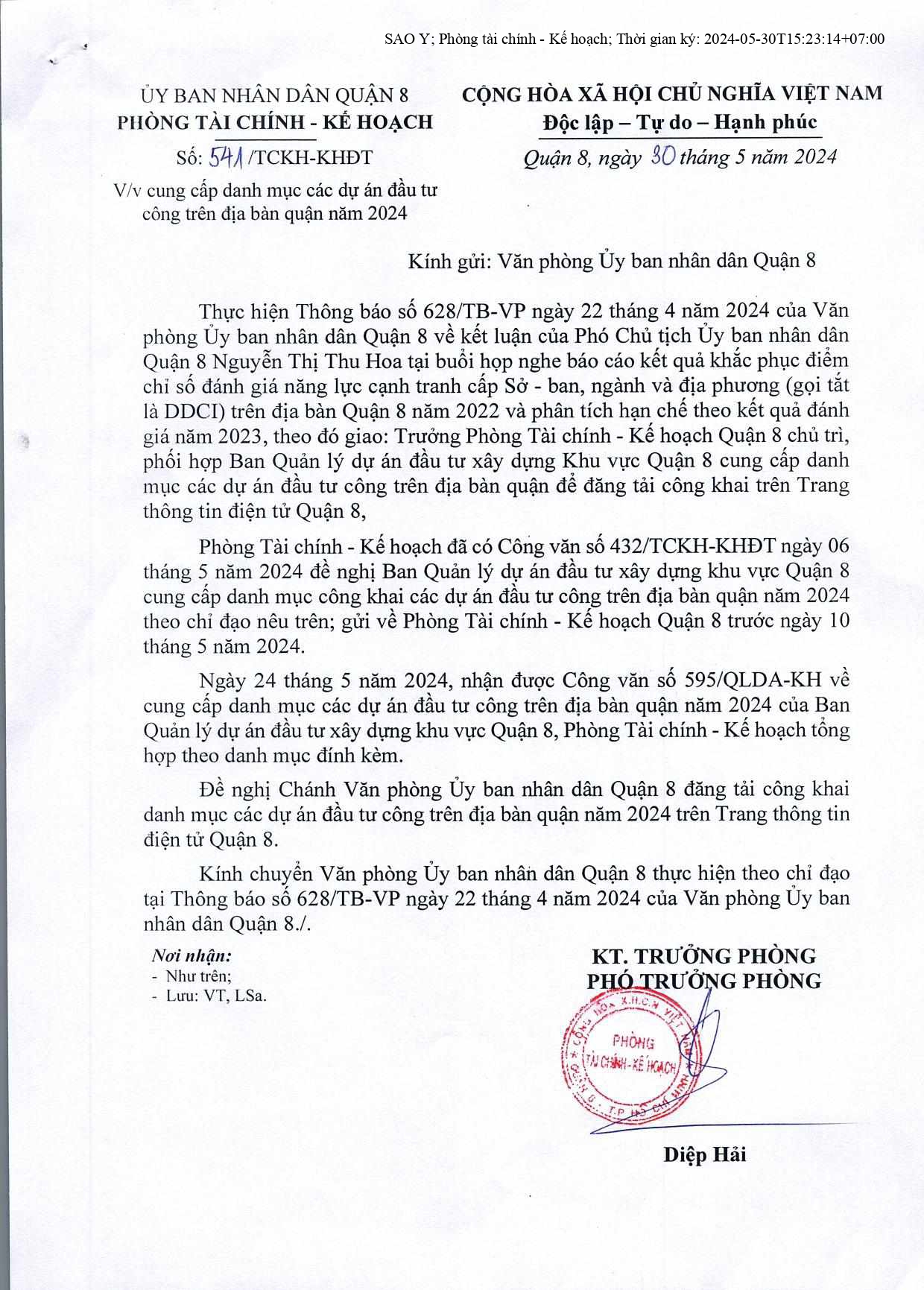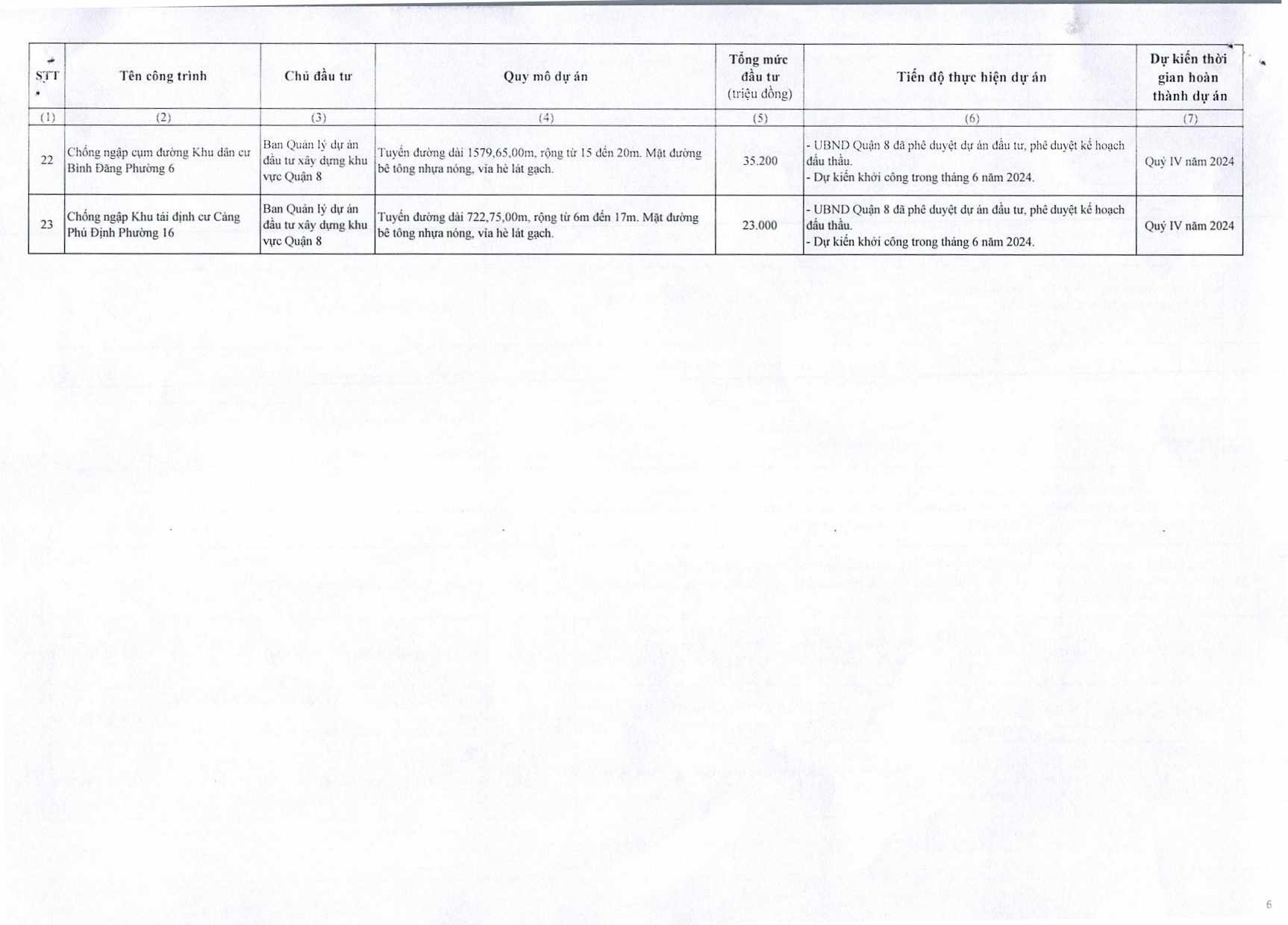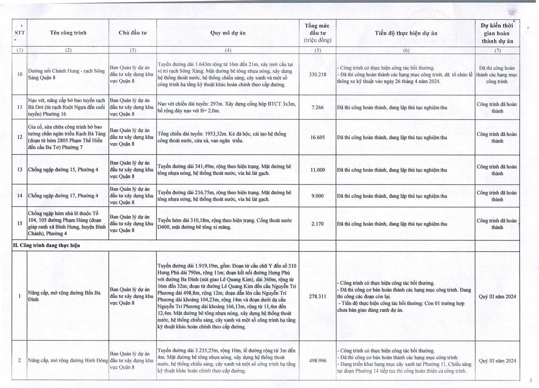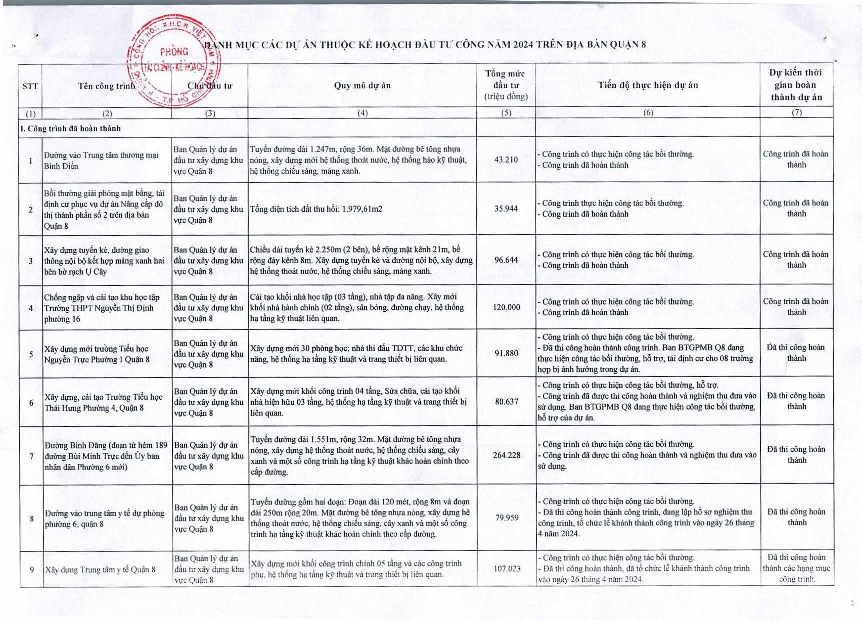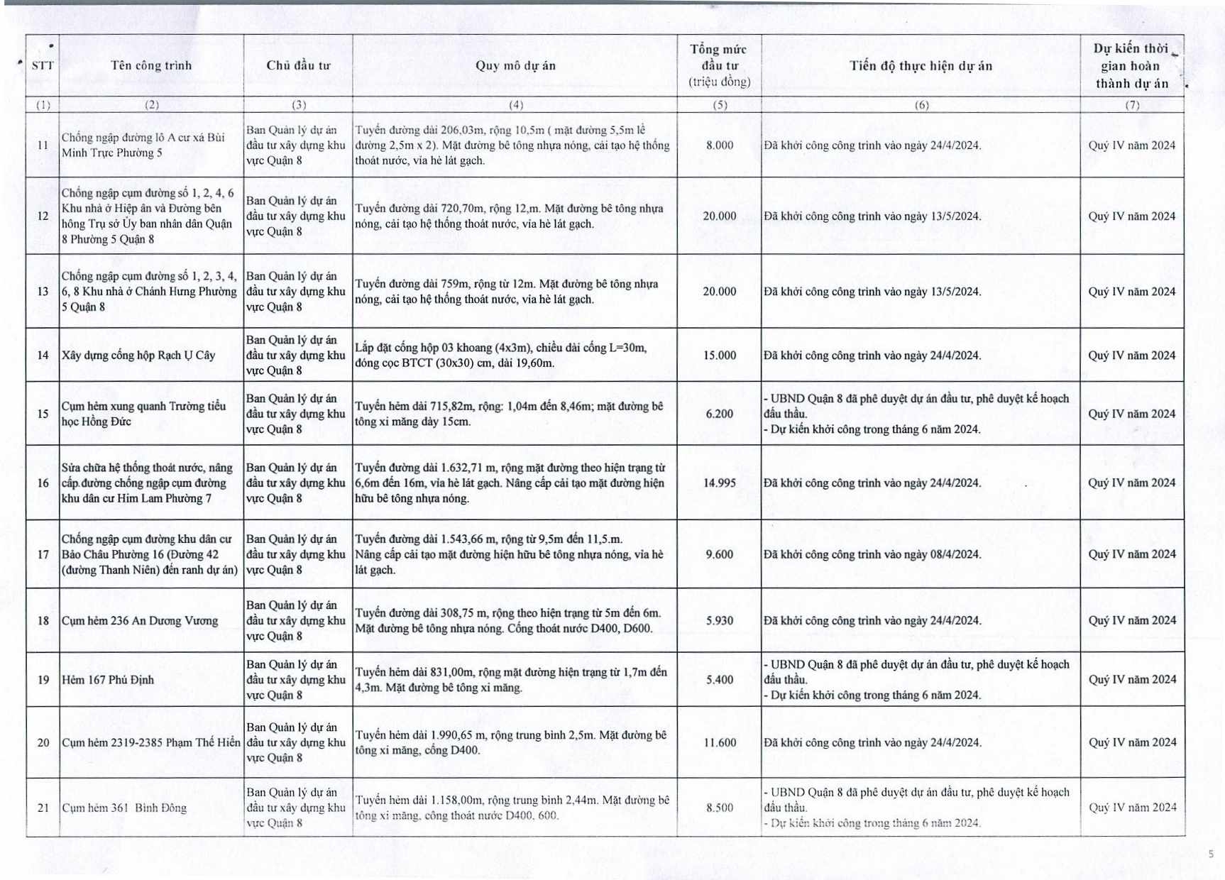 Cung cấp danh mục các dự án đầu tư công trên địa bàn quận năm 2024