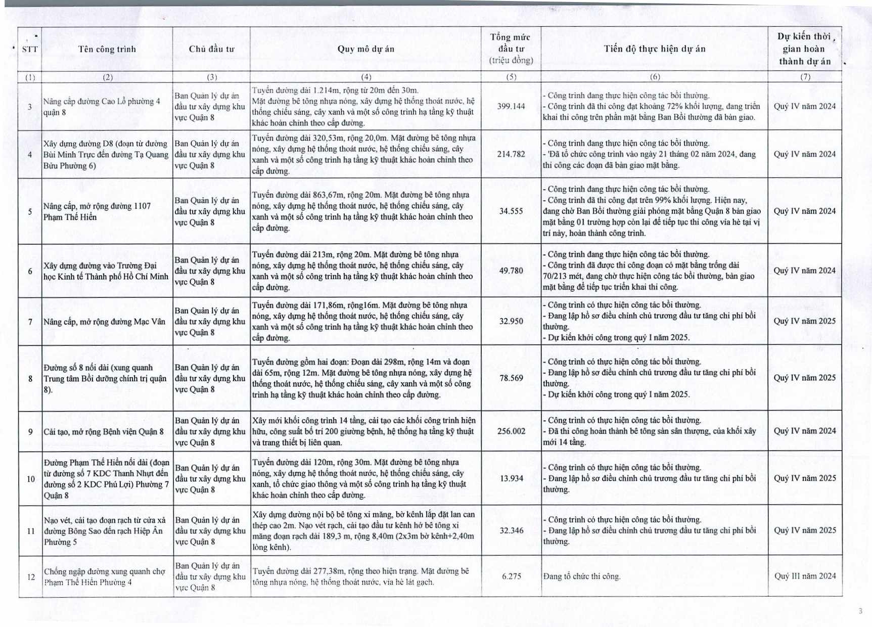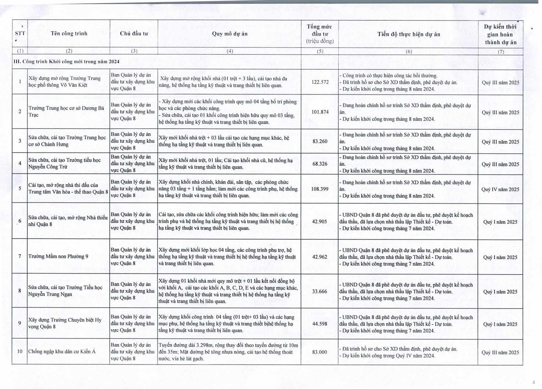 DANH MỤC CÔNG TRÌNH, DỰ ÁN TẠM NGƯNG CHUYỂN TIẾP TRONG KHSDĐ NĂM 2024 CỦA QUẬN 8