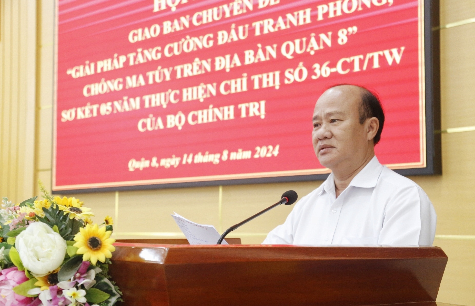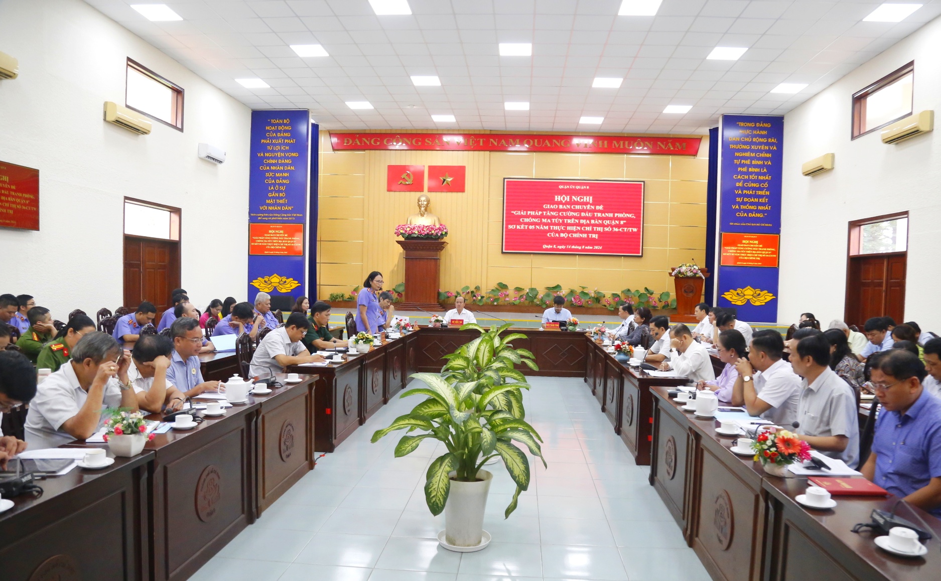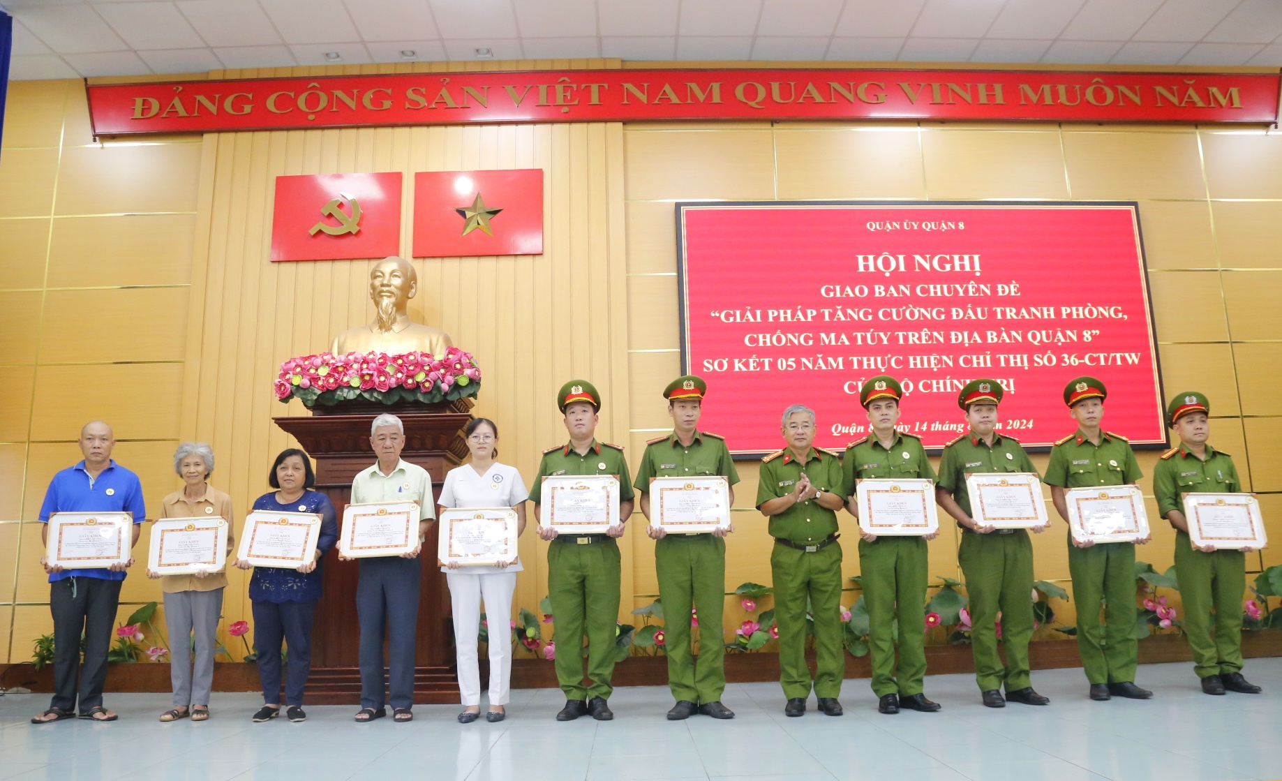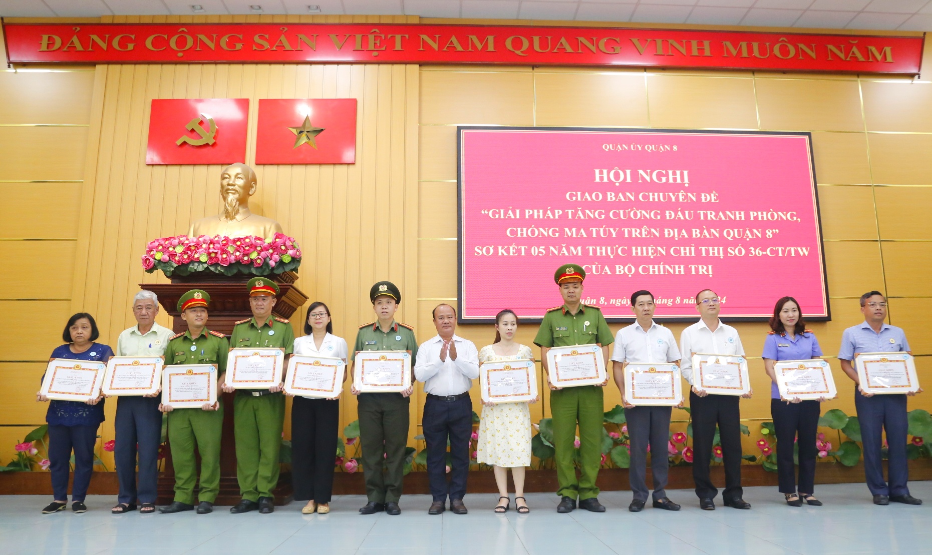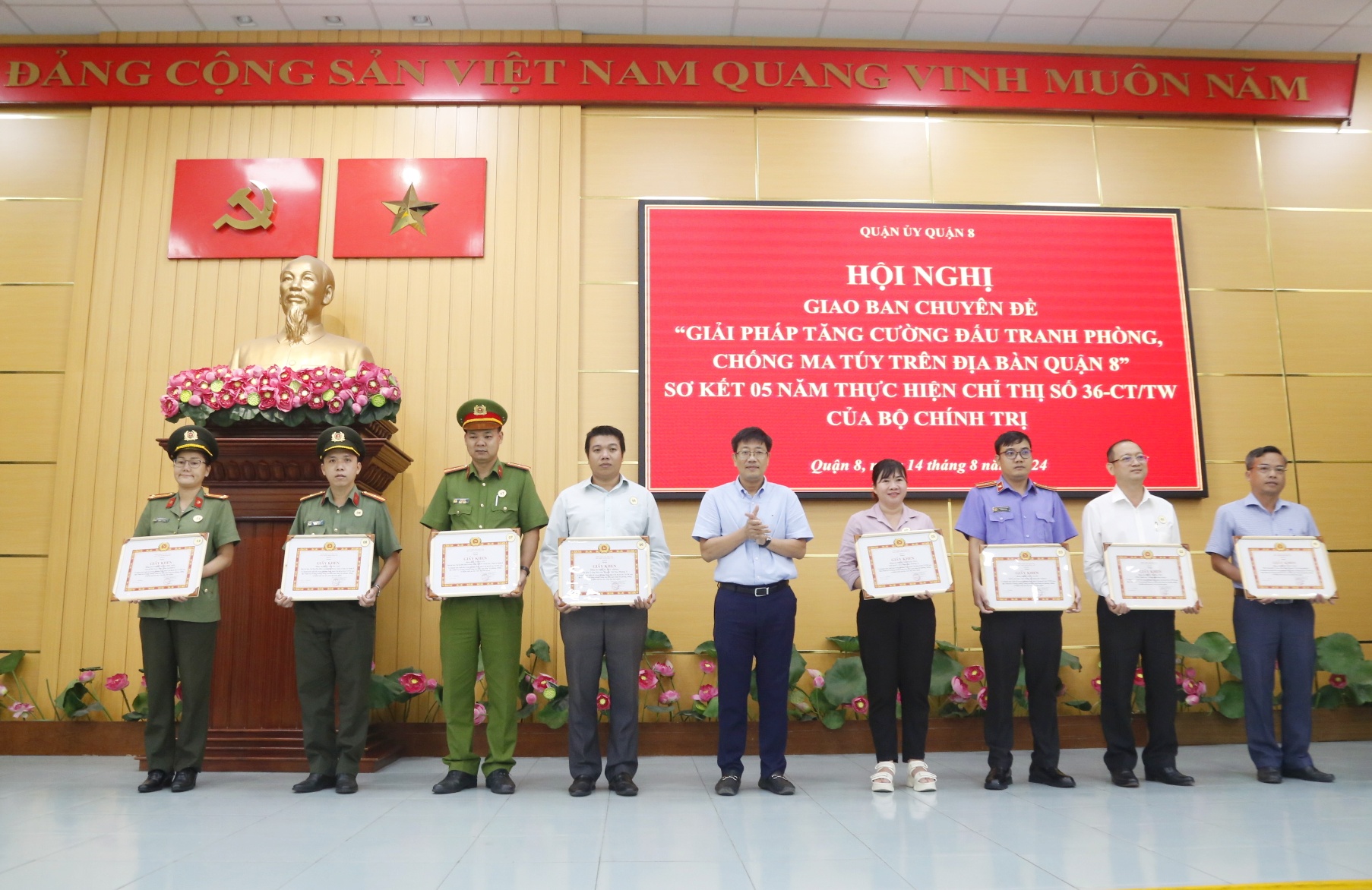 Sáng ngày 14/8, Quận ủy Quận 8 tổ chức hội nghị giao ban chuyên đề “Giải pháp tăng cường đấu tranh phòng, chống ma túy trên địa bàn quận” và sơ kết 05 năm thực hiện Chỉ thị số 36-CT/TW ngày 16 tháng 8 năm 2019 của Bộ Chính trị về tăng cường, nâng cao hiệu quả công tác phòng, chống và kiểm soát ma túy trên địa bàn quận (gọi tắt là Chỉ thị số 36-CT/TW).
