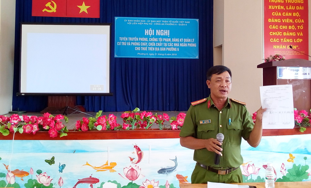 Tham dự hội nghị có các đồng chí: Đại diện Đội Quản lý hành chính về trật tự xã hội Công an Quận 8; Đội Xây dựng phong trào và Quản lý bảo vệ dân phố Công an Quận 8; Đội cảnh sát phòng cháy và chữa cháy Công an Quận 8; Lãnh đạo Đảng ủy - HĐND - UBND - Ủy ban MTTQ Việt Nam Phường 6; đại diện các ban ngành đoàn thể phường; Trưởng Khu phố; Trưởng Ban công tác Mặt trận các khu phố, Bảo vệ dân phố và trên 110 hộ dân có ngăn phòng cho thuê trên địa bàn phường.Tại Hội nghị tuyên truyền, các đại biểu đã được nghe: