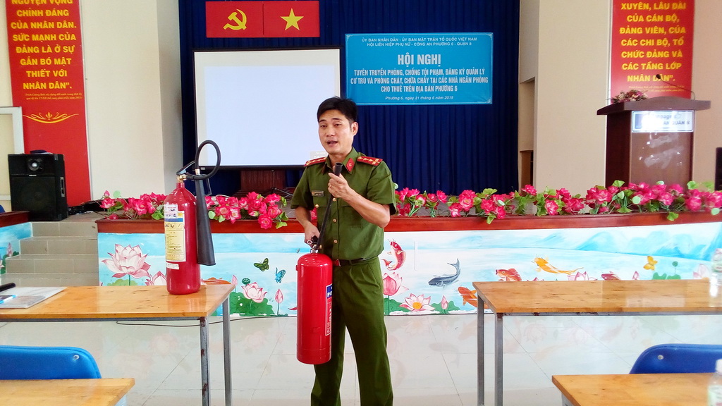 Đại diện Đội cảnh sát phòng cháy và chữa cháy Công an Quận 8: cung cấp thông tin về những vụ cháy lớn gây thiệt hại nghiêm trọng về người và tài sản xảy ra trên phạm vi cả nước và trên địa bàn thành phố và quận trong những năm gần đây; những kiến thức cơ bản về phòng cháy và chữa cháy, các văn bản pháp luật về phòng cháy và chữa cháy; các nguyên nhân gây ra cháy nổ; một số biện pháp phòng cháy chữa cháy tại cơ quan và gia đình; sử dụng phương tiện chữa cháy tại chỗ, những kỹ năng, cách xử lý tình huống khi xảy ra sự cố cháy nổ, kỹ năng thoát hiểm, biện pháp chữa cháy nhằm đảm bảo an toàn cho người và tài sản, đặc biệt tại các khu nhà trọ,…Sau phần lý thuyết, người dự hội nghị được hướng dẫn cách sử dụng các phương tiện chữa cháy như bình bột MFZ4, bình khí CO2… để dập tắt đám cháy và cách thức xử lý nhanh các tình huống cứu người bị nạn khi xảy ra sự cố cháy nổ.
