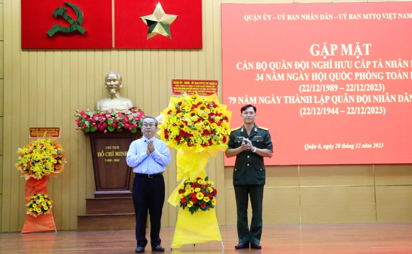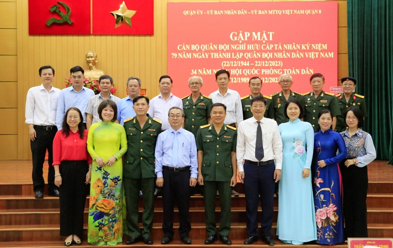 Ngày 20/12, Quận ủy - Ủy ban nhân dân - Ủy ban mặt trận Tổ quốc Việt Nam Quận 8 long trọng tổ chức buổi họp mặt cán bộ quân đội nghỉ hưu cấp tá nhân kỷ niệm 79 năm Ngày thành lập Quân đội nhân dân Việt Nam (22/12/1944 - 22/12/2023) và 34 năm Ngày Hội thao quốc phòng toàn dân (22/12/1989 - 22/12/2023).