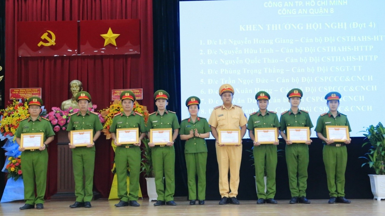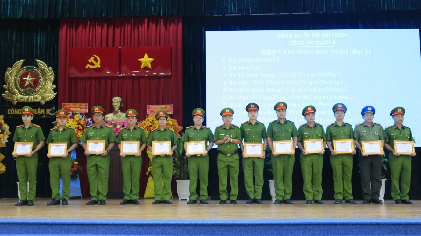 Dịp này, hội nghị đã tổ chức trao tặng danh hiệu đơn vị xuất sắc và danh hiệu chiến sĩ thi đua cơ sở cho các tập thể, cá nhân có thành tích xuất sắc trong phong trào thi đua "Vì an ninh tổ quốc" năm 2023; Quận ủy Quận 8 trao khen thưởng cho tập thể Đảng bộ Công an quận có thành tích xuất sắc trong công tác đảm bảo an ninh chính trị, trật tự an toàn xã hội trên địa bàn quận năm 2023 và khen thưởng 10 tập thể, cá nhân có thành tích nổi bật trong công tác đấu tranh, khám phá các chuyên án lớn trong năm 2023.