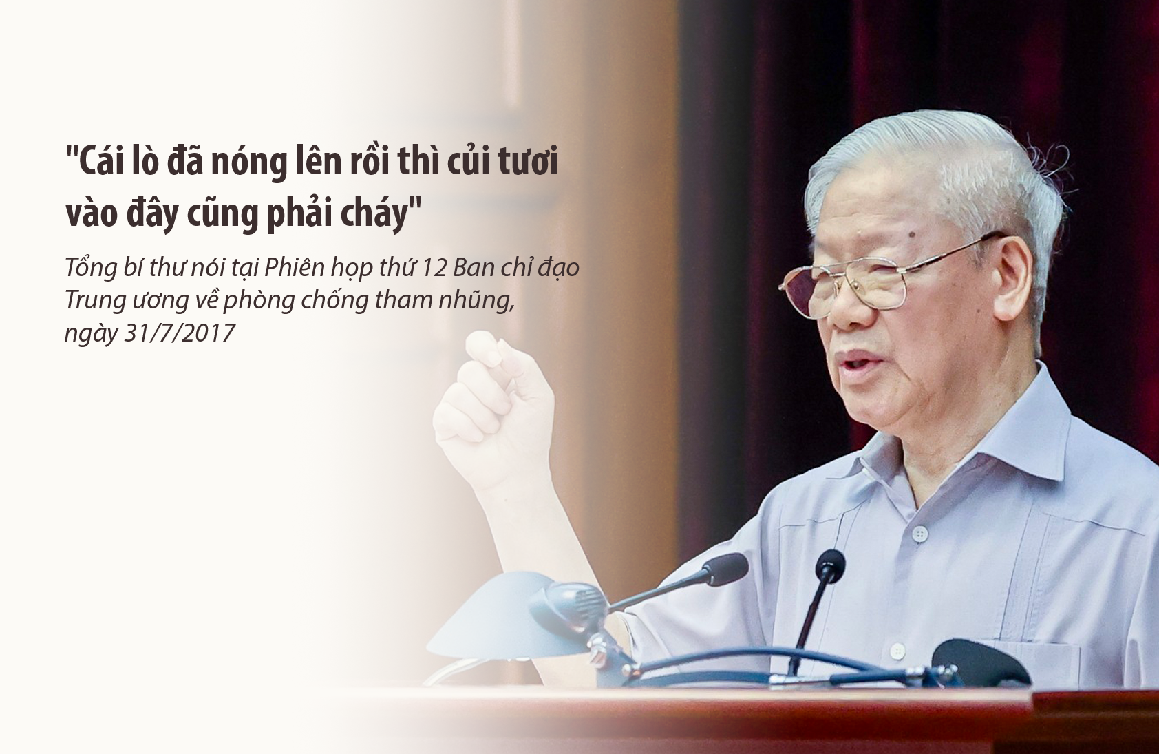 Tổng bí thư từng nhiều lần tâm sự, xử lý cán bộ là điều không ai mong muốn, song tham nhũng là một trong những nguy cơ đe dọa sự tồn vong của Đảng và chế độ, nên phải làm vì sự nghiệp chung. Đây là "cuộc đấu tranh chống giặc nội xâm", "xử một vài người để cứu muôn người", đồng thời cảnh tỉnh, răn đe những cán bộ đang có ý định vi phạm.