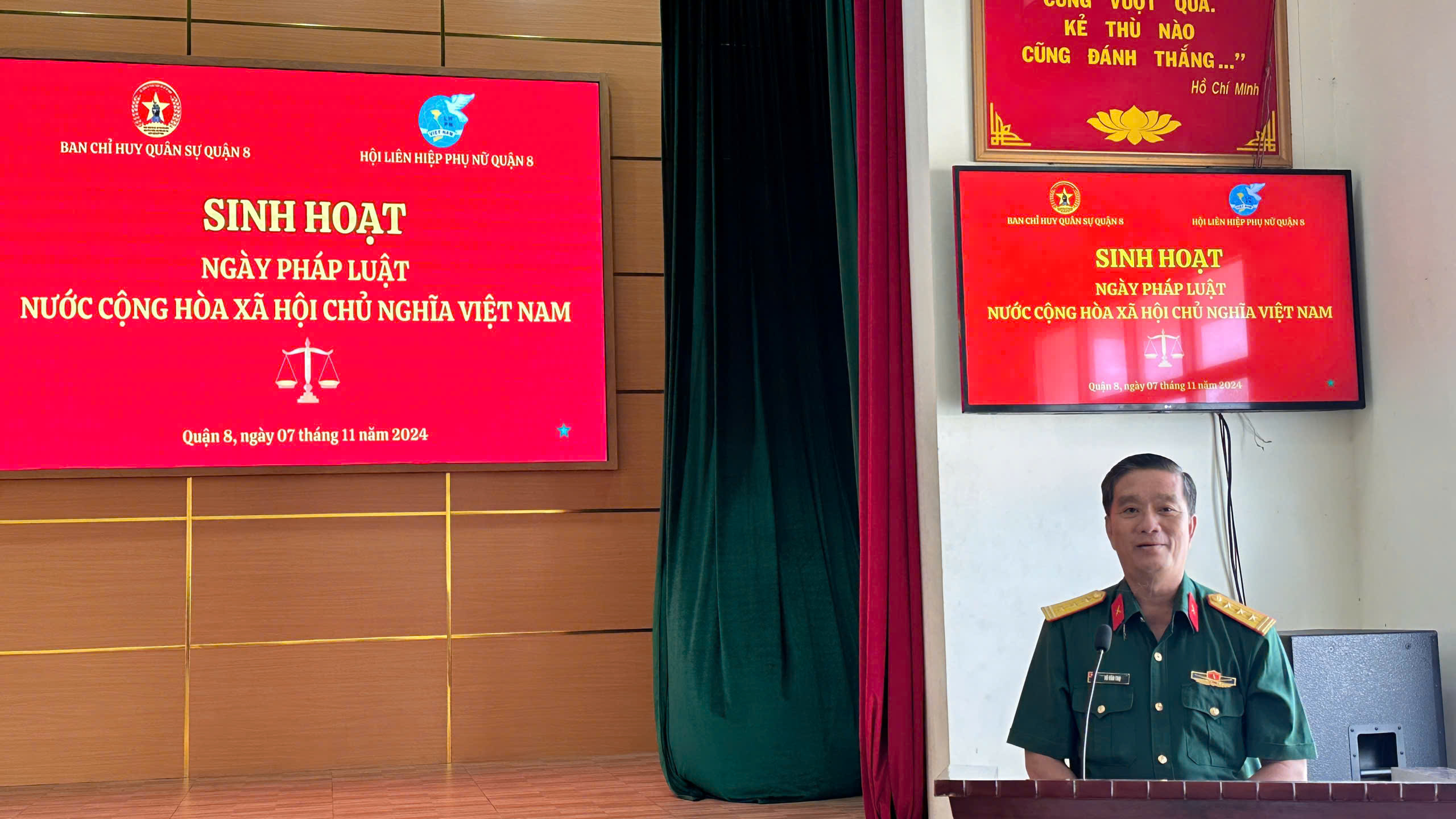 Phát biểu chỉ đạo, đồng chí Thượng tá Võ Văn Thọ, Phó Chủ Nhiệm Chính trị Bộ Tư lệnh Thành phố Hồ Chí Minh ghi nhận, đánh giá cao, biểu dương các hoạt động hưởng ứng Ngày Pháp luật Việt Nam năm 2024 của Ban CHQS Quận 8, đặc biệt là sự quan tâm, phối hợp, hỗ trợ của Hội LHPN quận và sự tham gia tích cực của hội viên phụ nữ để Ban CHQS quận tổ chức buổi sinh hoạt.