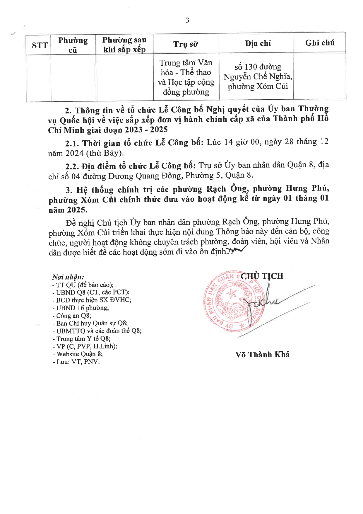 THÔNG BÁO VỀ VIỆC SẮP XẾP ĐƠN VỊ HÀNH CHÍNH CẤP XÃ GIAI ĐOẠN 2023 - 2025 TRÊN ĐỊA BÀN QUẬN 8