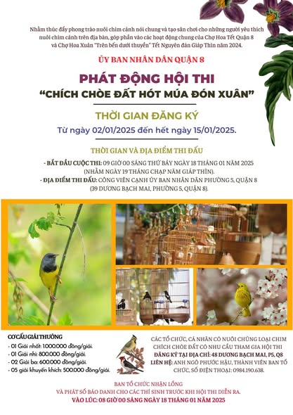 - Các hội thi quen thuộc như Hội thi Ảnh Nghệ thuật, Trang trí “Nhà hoa,” Thư pháp chữ Việt, và “Chích chòe đất hót múa đón Xuân” tiếp tục được tổ chức với quy mô mở rộng, hứa hẹn nhiều màn trình diễn đặc sắc.