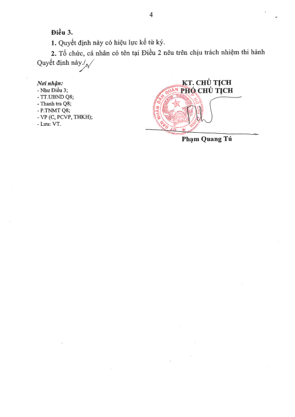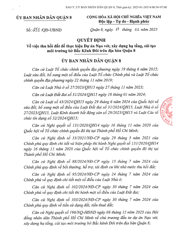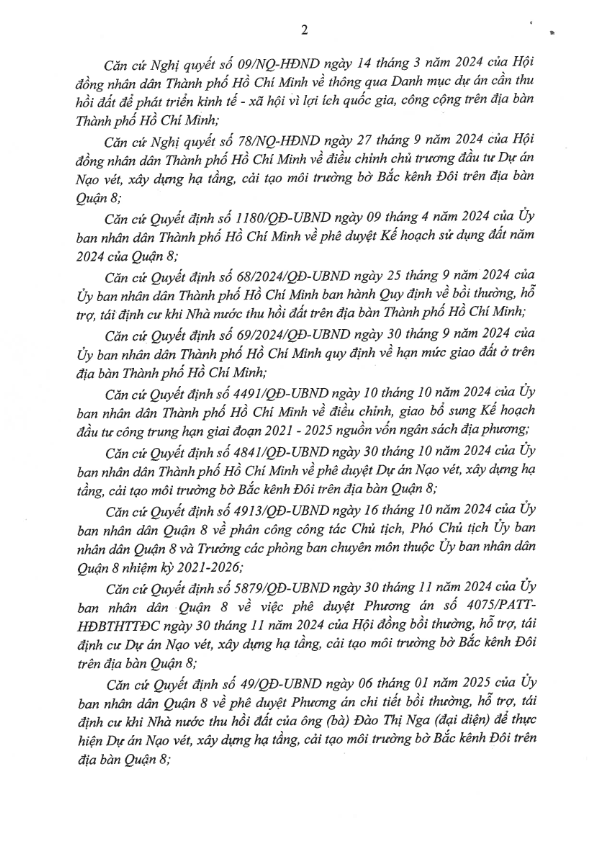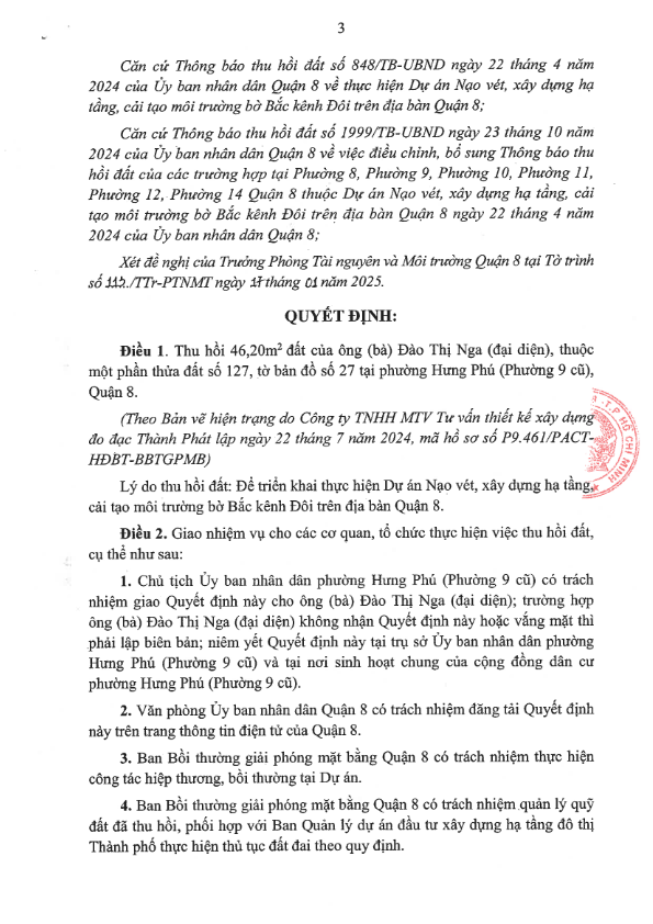 Quyết Định về việc thu hồi đất để thực hiện dự án nạo vét xây dựng hạ tầng cải tạo môi trường bờ bắc kênh đôi trên địa bàn Quận 8 ông ( bà ) Đào Thị Nga