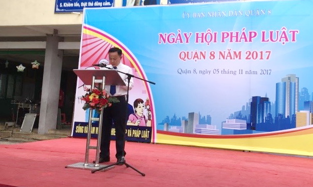 Ông Nguyễn Thanh Sang – Quận ủy viên, Phó Chủ tịch UBND Quận 8, Chủ tịch Hội đồng phối hợp phổ biến giáo dục Quận 8 phát biểu tại Ngày hội pháp luật 2017