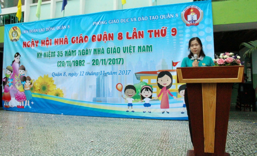Bà Trần Thanh Hà - QUV, Chủ tịch Liên đoàn Lao động Quận 8 phát biểu khai mạc ngày hội, chúc mừng và tri ân các Thầy cô giáo nhân ngày nhà giáo Việt Nam. Trong lễ khai mạc, Liên đoàn lao động quận đã tổ chức trao 01 mái ấm công đoàn trị giá 30 triệu đồng cho đoàn viên công đoàn là giáo viên trường THCS Lê Lai khó khăn về nhà ở và trao 33 phần quà mỗi phần trị giá 1.000.000 đ cho các trường hợp Giáo viên bị bệnh nan y có hoàn cảnh khó khăn.