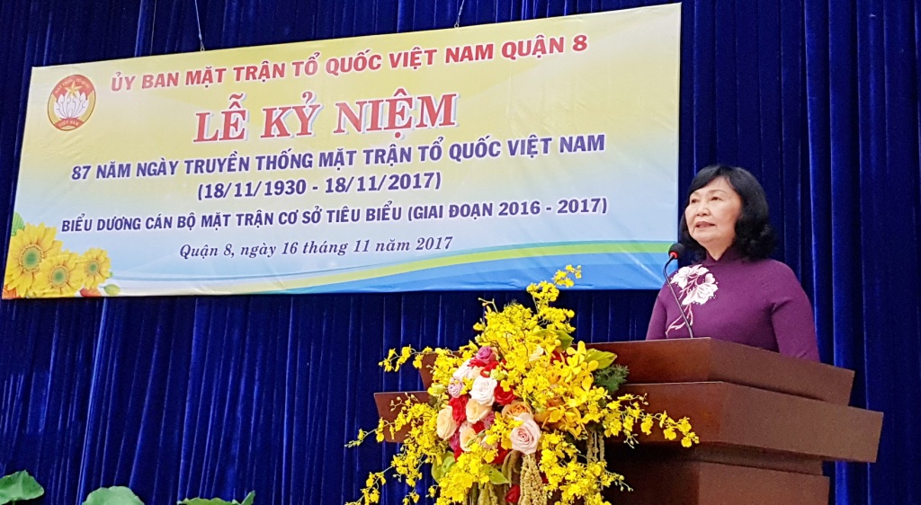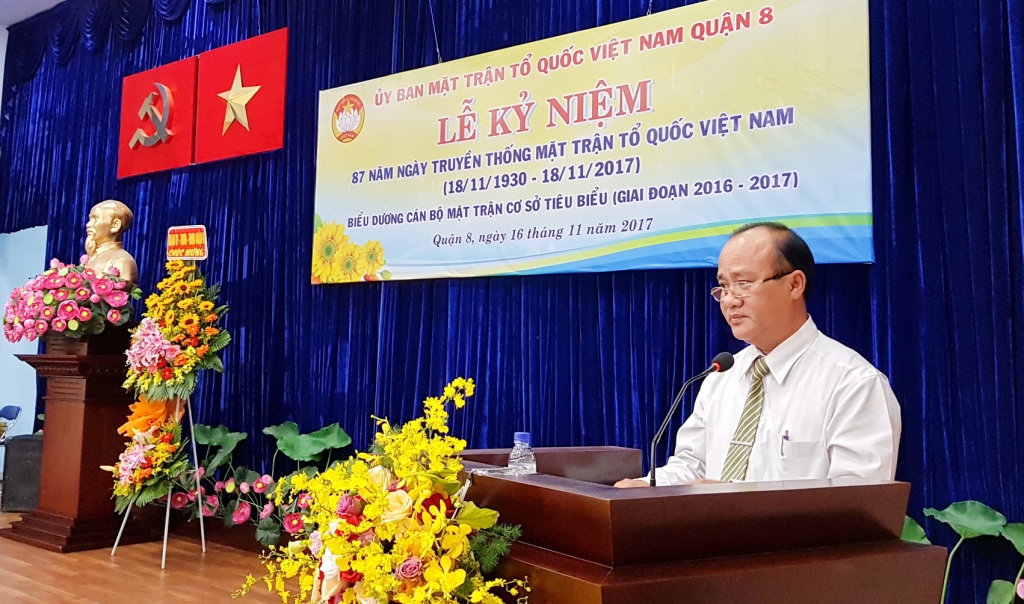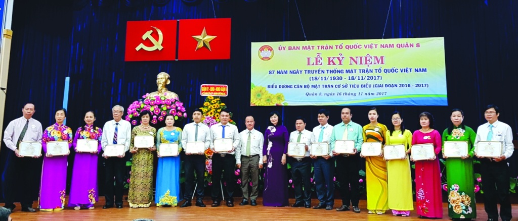Trong không khí hân hoan chào mừng kỷ niệm 87 năm ngày truyền thống Mặt trận Tổ quốc Việt Nam. Sáng ngày 16/11/2017 tại Hội trường Ủy ban Mặt trận Tổ quốc, các đoàn thể Quận 8, Ủy ban Mặt trận Tổ quốc Việt Nam Quận 8 long trọng tổ chức Lễ kỷ niệm 87 năm Ngày truyền thống Mặt trận Tổ quốc Việt Nam (18/11/1930 - 18/11/2017) và biểu dương cán bộ Mặt trận cơ sở tiêu biểu (giai đoạn 2016 - 2017).