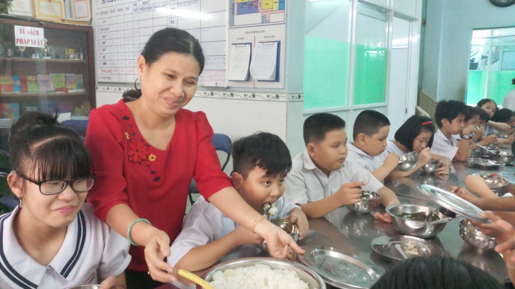 Cô Nguyễn Thị Thanh Trúc đang chăm lo bữa ăn trưa của trẻ