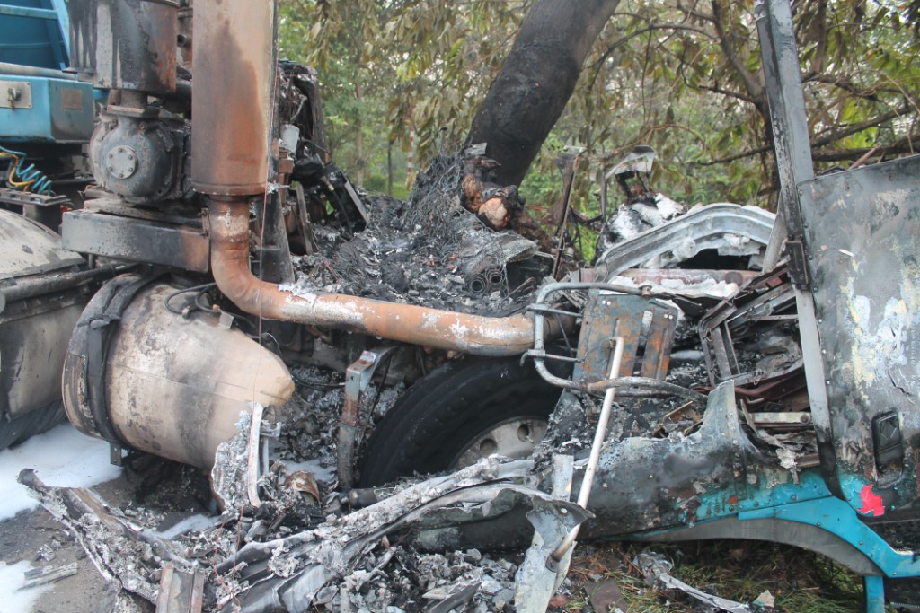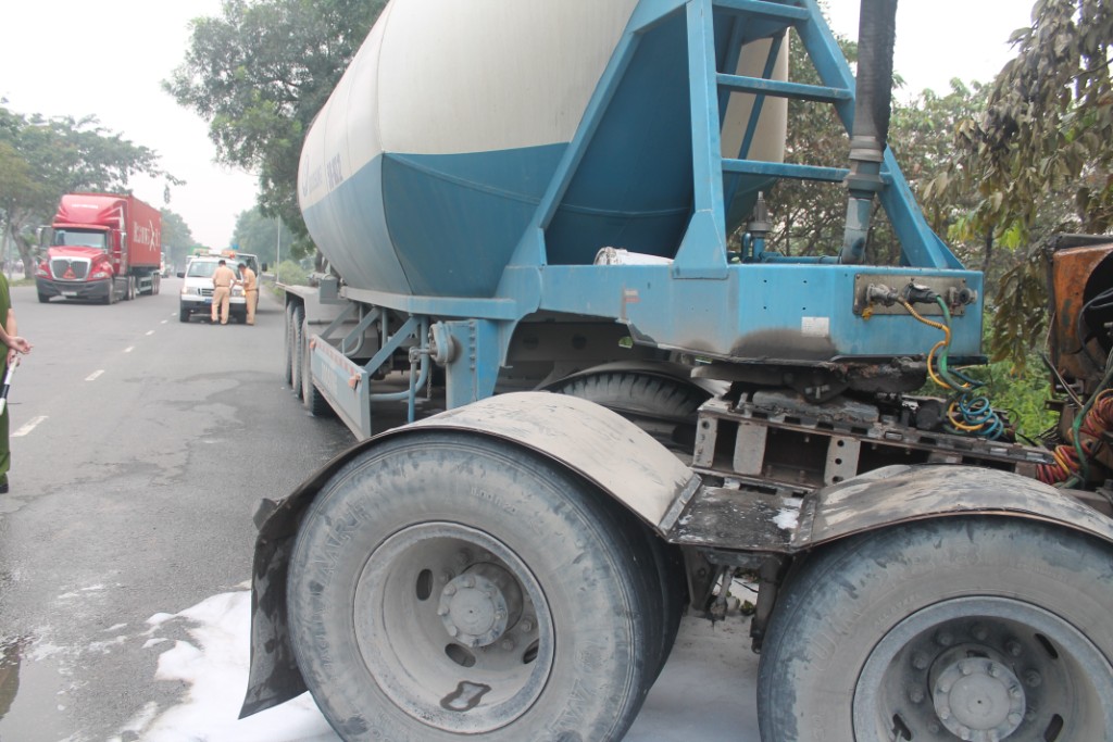Tại hiện trường chiếc xe đầu kéo kéo theo rơ moóc bồn trộn bê tông đâm vào gốc cây xanh, đầu xe lao xuống mương nước ven đường, phần ca bin gần như cháy hoàn toàn, tài xế chết cháy nằm gục trong cabin, không kịp thoát ra ngoài; bước đầu, tài xế tử vong được xác định tên Vũ, ngụ Tỉnh Long An. Rất nhiều người đi đường hiếu kỳ dừng phương tiện lại xem gây ùn tắc tại khu vực xảy ra cháy.