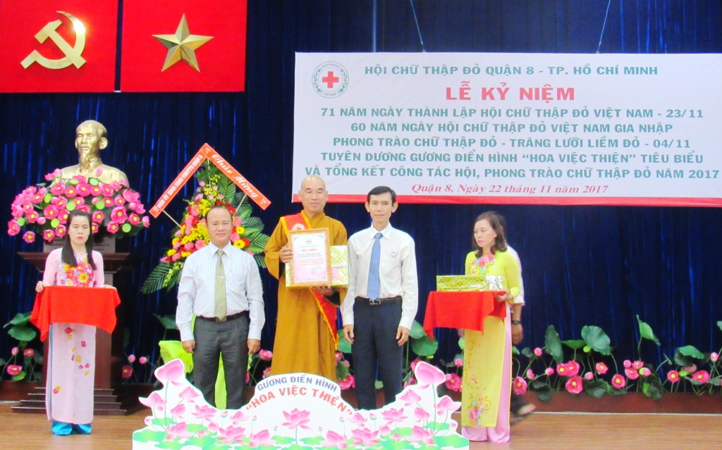 Dịp này, Ban Tổ chức chương trình đã trao tặng giấy khen Hội Chữ thập đỏ Thành phố cho 26 tập thể và 33 cá nhân; giấy khen và quà của Hội Chữ thập đỏ Quận 8 cho 25 tập thể và 48 cá nhân có thành tích tốt trong công tác Hội và phong trào Chữ thập đỏ; đồng thời, tuyên dương 71 gương điển hình “Hoa việc thiện” năm 2017.