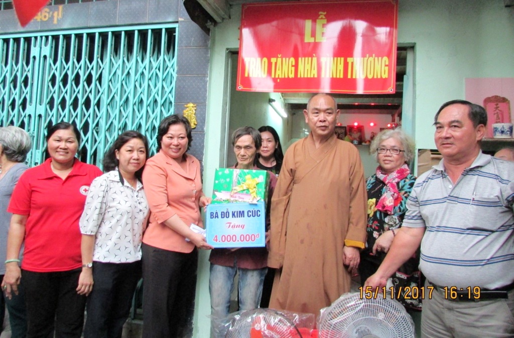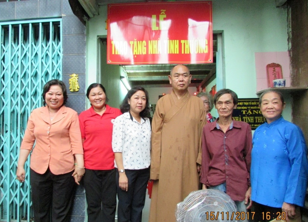 Thượng tọa Thích Huệ Công – Trưởng Ban Bảo trợ Hội Chữ thập đỏ Quận 8 và đại diện đơn vị tài trợ - gia đình Lý Muội khánh thành trao tặng nhà tình thương cho hộ ông Hà Minh