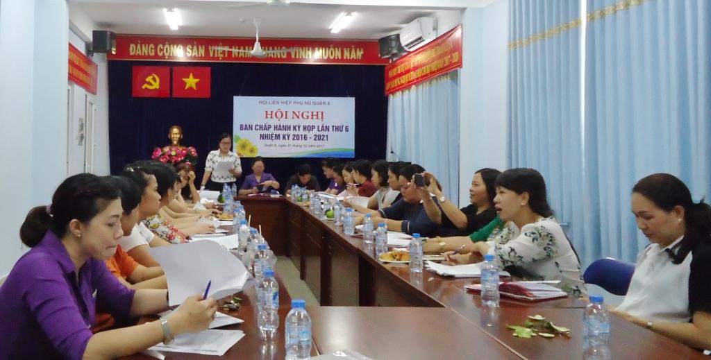 Sáng ngày 01 tháng 12 năm 2017, Hội Liên hiệp Phụ nữ Quận 8 tổ chức Hội nghị Ban Chấp hành kỳ họp lần thứ 6 nhiệm kỳ 2016 – 2021, chuẩn bị nội dung tổng kết phong trào phụ nữ và hoạt động Hội năm 2017.