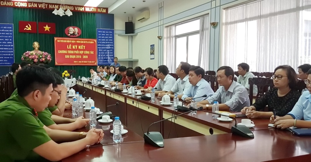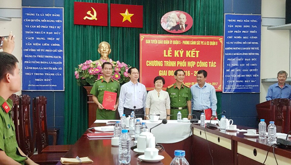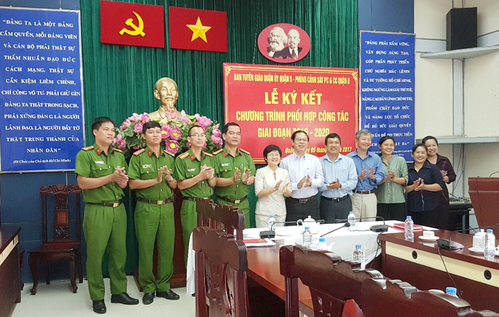 Sáng ngày 05/12/2017, vào lúc 08 giờ 00, Lễ ký kết Chương trình phối hợp công tác giai đoạn 2016 - 2020 giữa Phòng Cảnh sát PC&CC Quận 8 và Ban Tuyên giáo Quận 5 đã diễn ra tại Hội trường Quận ủy Quận 5, số 211 An Dương Vương, Phường 8, Quận 5. Đến dự có đồng chí Cao Văn Phận – Phó Trưởng Phòng Tuyên truyền Ban Tuyên giáo Thành ủy, đồng chí Trần Thị Anh Vũ – Phó Bí thư thường trực Quận ủy Quận 5, đồng chí Hà Việt Cường - Trưởng Ban Tuyên giáo Quận 5, đồng chí Thượng tá Phạm Trí Thảo – Trưởng Phòng Cảnh sát PC&CC Quận 8 và cán bộ thuộc Ban Tuyên giáo Quận 5, Ban Chỉ huy các đội thuộc Phòng Cảnh sát PC&CC Quận 8.