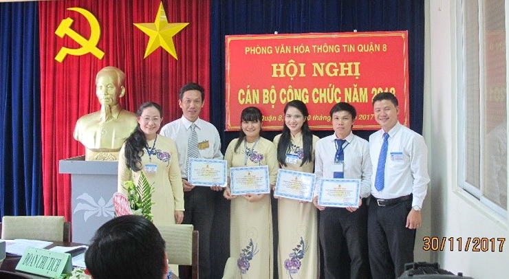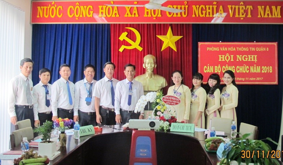 Thực hiện Chỉ thị số 03/CT – UBND ngày 21 tháng 11 năm 2017 của Ủy ban nhân dân Quận 8 và Hướng dẫn số 11/HD-LĐLĐ ngày 06/11/2017 của Liên đoàn Lao động Quận 8 về việc tổ chức Hội nghị cán bộ, công chức,viên chức năm 2018. Chiều ngày 30 tháng 11 năm 2017, Phòng Văn hóa và Thông tin Quận 8 tổ chức Hội nghị CBCC năm 2018. Đến dự có Ông Trần Văn Thắng, Phó Chủ tịch Liên đoàn Lao động Quận 8; Bà Cao Thị Ánh Loan, Chuyên viên Phòng Nội vụ Quận 8; Bà Trần Thị Thu Trang, Quận ủy viên, Bí thư Chi bộ - Thủ trưởng đơn vị cùng tập thể cán bộ công chức đơn vị.