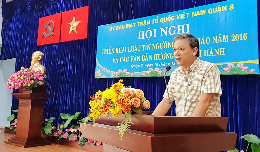 Nhằm triển khai thực hiện thống nhất, đồng bộ, chủ trương, chính sách về tín ngưỡng, tôn giáo của Đảng và Nhà nước, các quy định của pháp luật trong công tác quản lý Nhà nước về tín ngưỡng, tôn giáo. Chiều ngày 15 tháng 12 năm 2017, tại Hội trường Ủy ban MTTQ, các đoàn thể Quận 8, Ủy ban Mặt trận Tổ quốc Việt Nam Quận 8 phối hợp cùng Phòng Nội vụ Quận 8 và Phòng Tư pháp Quận 8 tổ chức Hội nghị triển khai Luật Tín ngưỡng, Tôn giáo năm 2016 và các văn bản hướng dẫn thi hành.