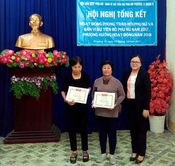 Ông Phan Văn Phụng – Phó Chủ tịch UBND phường và Bà Nguyễn Thị Thanh Xuân – Chủ tịch Hội Liên hiệp phụ nữ Phường 11 trao Giấy khen cho 10 cá nhân có thành tích xuất sắc trong hoạt động phong trào Hội Liên hiệp phụ nữ năm 2017.