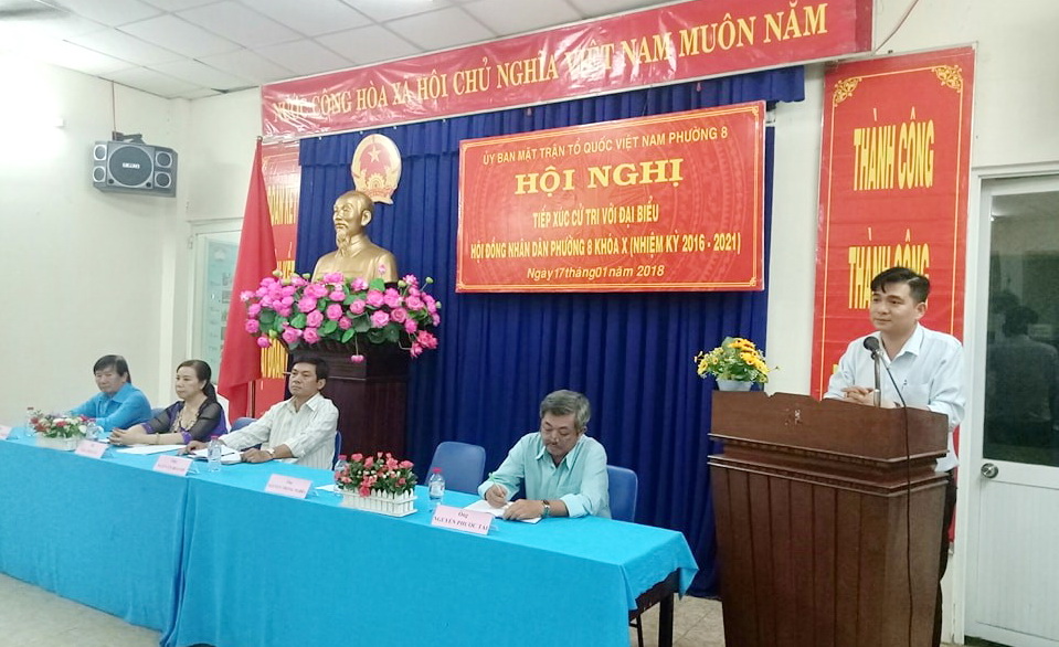 Tối ngày 16, 17/01/2018 Ban Thường trực Ủy ban Mặt trận Tổ quốc Phường 8 phối hợp tổ chức Hội nghị tiếp xúc giữa Tổ đại biểu Hội đồng nhân dân với cử tri trên địa bàn phường sau kỳ họp thứ năm Hội đồng nhân dân Phường 8 khóa X tại 4 khu phố.