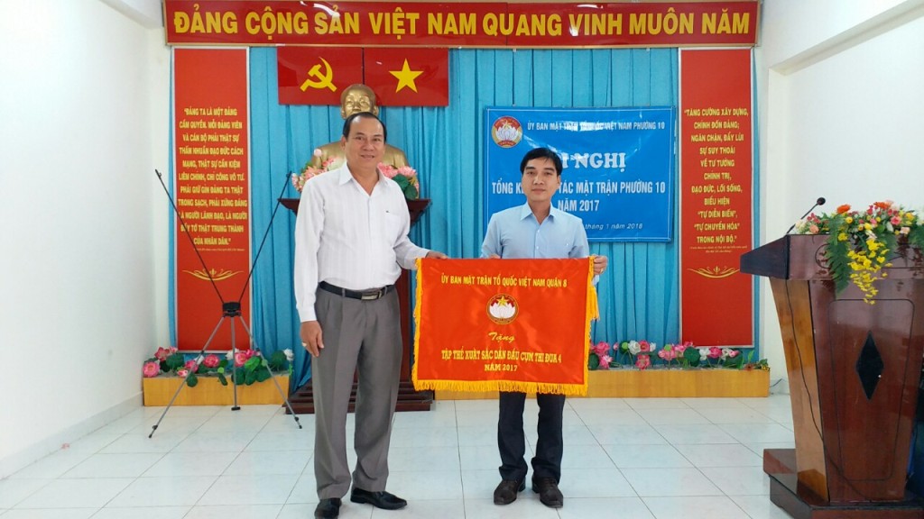 Ông Mai Hồng Hồng Phong, Phó Chủ tịch Thường trực Ủy ban Mặt trận Tổ quốc Việt Nam Quận 8 tặng cờ lưu niệm cho Ủy ban Mặt trận Tổ quốc Việt Nam Phường 10 (đơn vị xuất sắc dẫn đầu cụm thi đua 4).