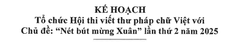 Trên đây là kế hoạch tổ chức Hội thi viết thư pháp chữ Việt với chủ đề: “Nét bút mừng Xuân” lần thứ 2 năm 2025, đề nghị các đơn vị phối hợp triển khai thực hiện./.