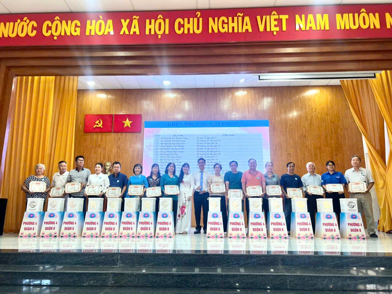 Nhằm tôn vinh những đóng góp của cán bộ khu phố, tổ dân phố trong quá trình công tác trên địa bàn phường 4 thời gian qua, Ủy ban nhân dân Phường 4 đã trao tặng giấy khen cấp quận và quà đối với 103 cá nhân có thời gian công tác từ 10 đến dưới 30 năm; giấy khen cấp phường và quà đối với 257 cá nhân có thời gian công tác dưới 10 năm. Đồng thời, đề xuất nhận Bằng khen cấp thành phố 19 cá nhân, giấy khen cấp quận 103 cá nhân và ban hành Quyết định khen thưởng cấp phường 05 tập thể và 34 cá nhân có thành tích xuất sắc trong quá trình tham gia công tác sắp xếp khu phố, tổ dân phố; 257 cá nhân đã tích cực tham gia hoạt động tại khu phố, tổ dân phố trong giai đoạn 1975 đến nay.