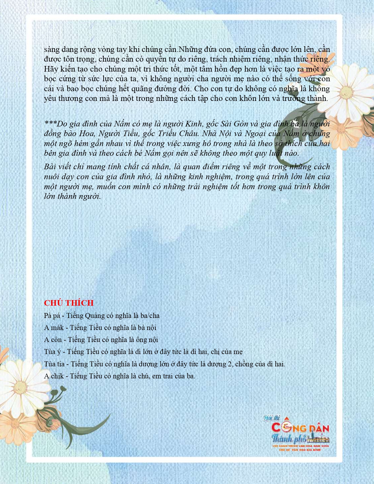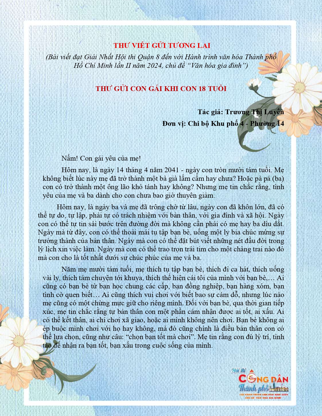 THƯ VIẾT GỬI TƯƠNG LAI - BÀI VIẾT ĐẠT GIẢI NHÌ HỘI THI "QUẬN 8 ĐẾN VỚI HÀNH TRÌNH VĂN HÓA TPHCM" LẦN THỨ II NĂM 2024