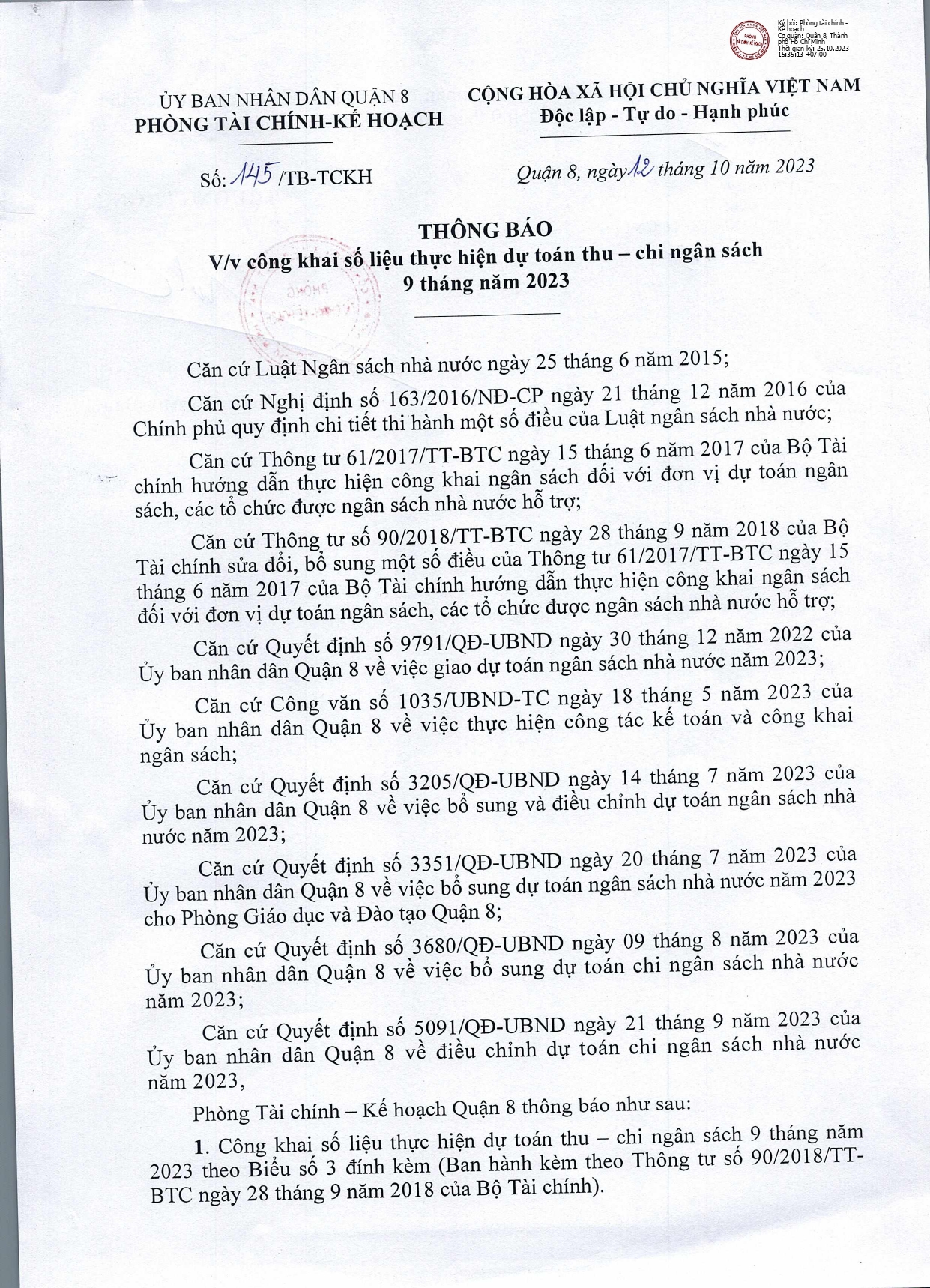 Thông báo về việc công khai số liệu thực hiện dự toán thu - chi ngân sách 9 tháng năm 2023