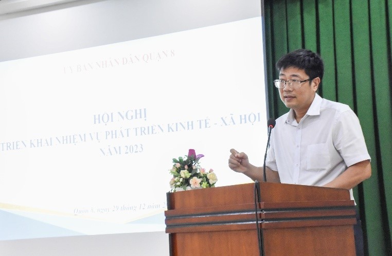 Sáng ngày 29/12/2022, UBND Quận 8 tổ chức hội nghị triển khai nhiệm vụ phát triển kinh tế - xã hội năm 2023. Dự và chỉ đạo hội nghị có đồng chí Võ Ngọc Quốc Thuận, Thành ủy viên, Bí thư Quận ủy Quận 8; đồng chí Trần Thanh Tùng, Phó Bí thư, Chủ tịch UBND quận.