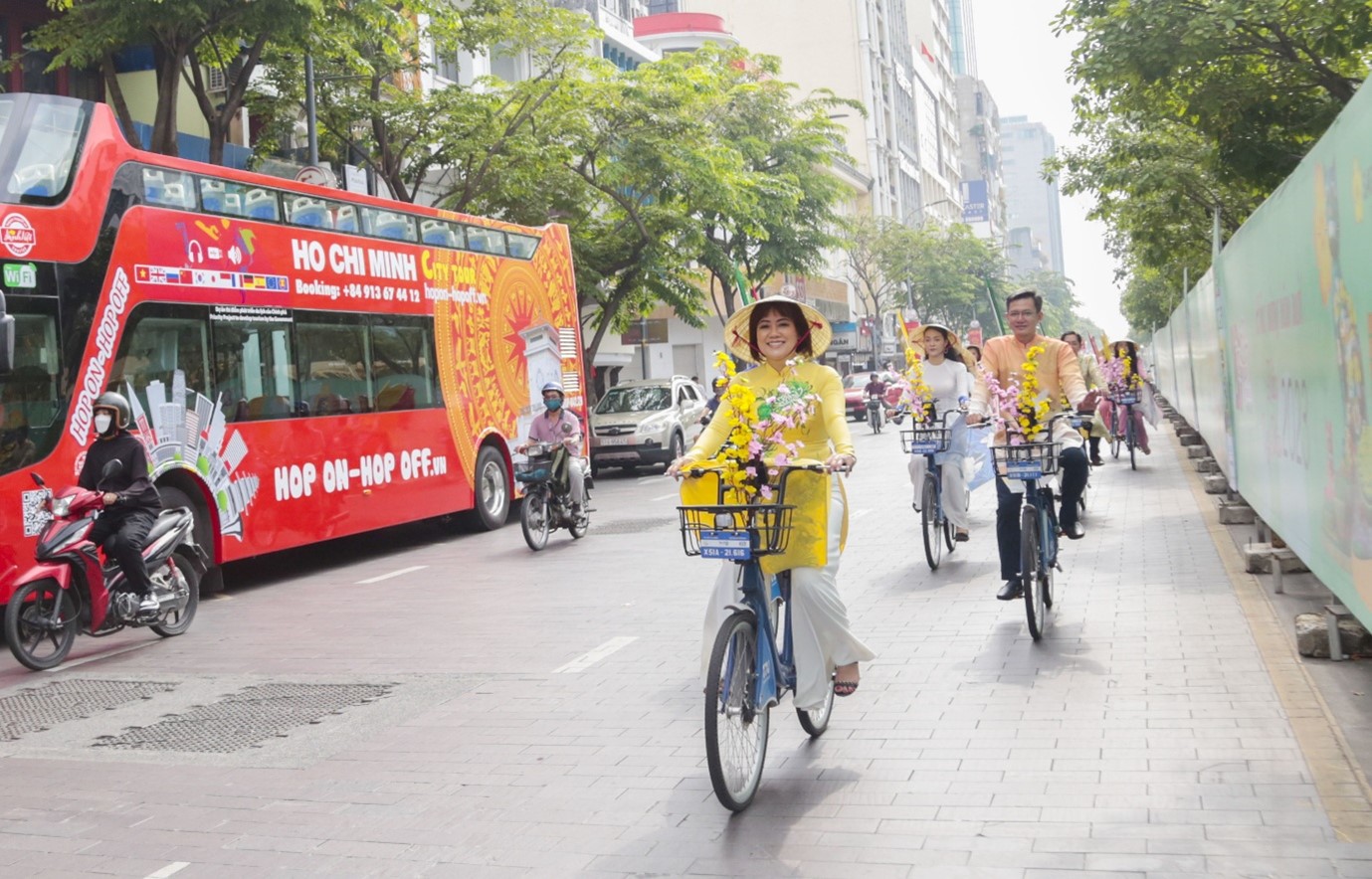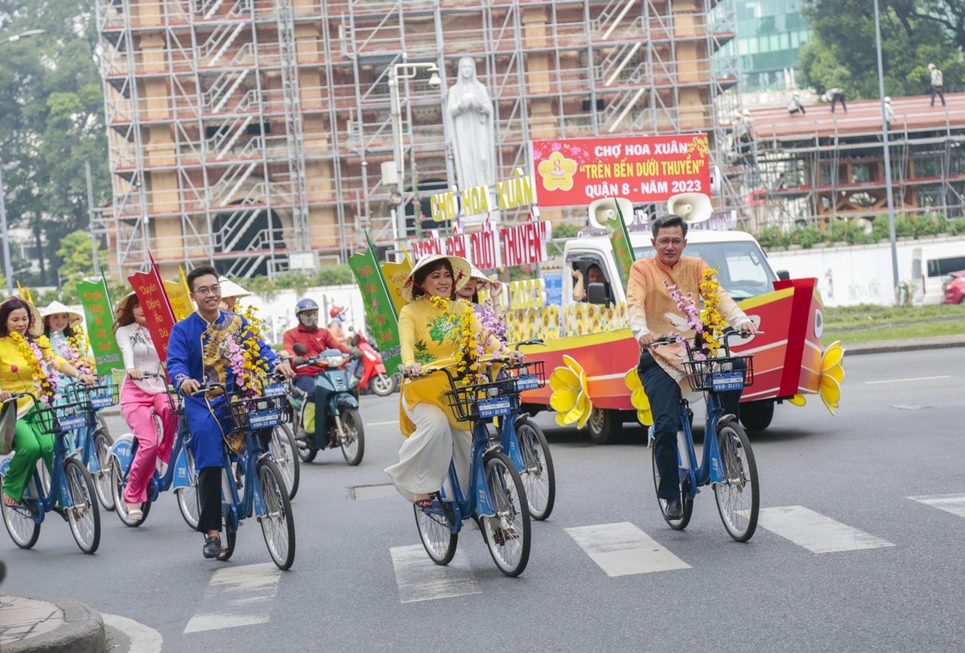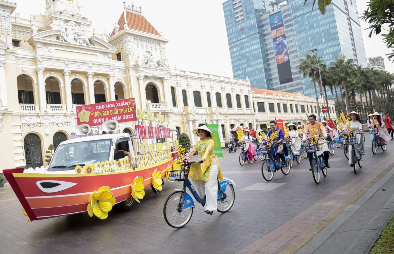 Sau lễ dâng hoa, các thành viên trong đoàn thực hiện diễu hành xe đạp hoa theo lộ trình: phố đi bộ Nguyễn Huệ - đường Lê Thánh Tôn - đường Pasteur - đường Alexander de Rhodes - đường Phạm Ngọc Thạch - đường Đồng Khởi - đường Tôn Đức Thắng - đường Nguyễn Huệ. Đây là hoạt động nhằm quảng bá, tuyên truyền các hoạt động Chợ Hoa Xuân "Trên bến dưới thuyền" Quận 8 năm 2023 đến gần với mọi người, chương trình được khai mạc vào lúc 19h00 ngày 16/01/2023.