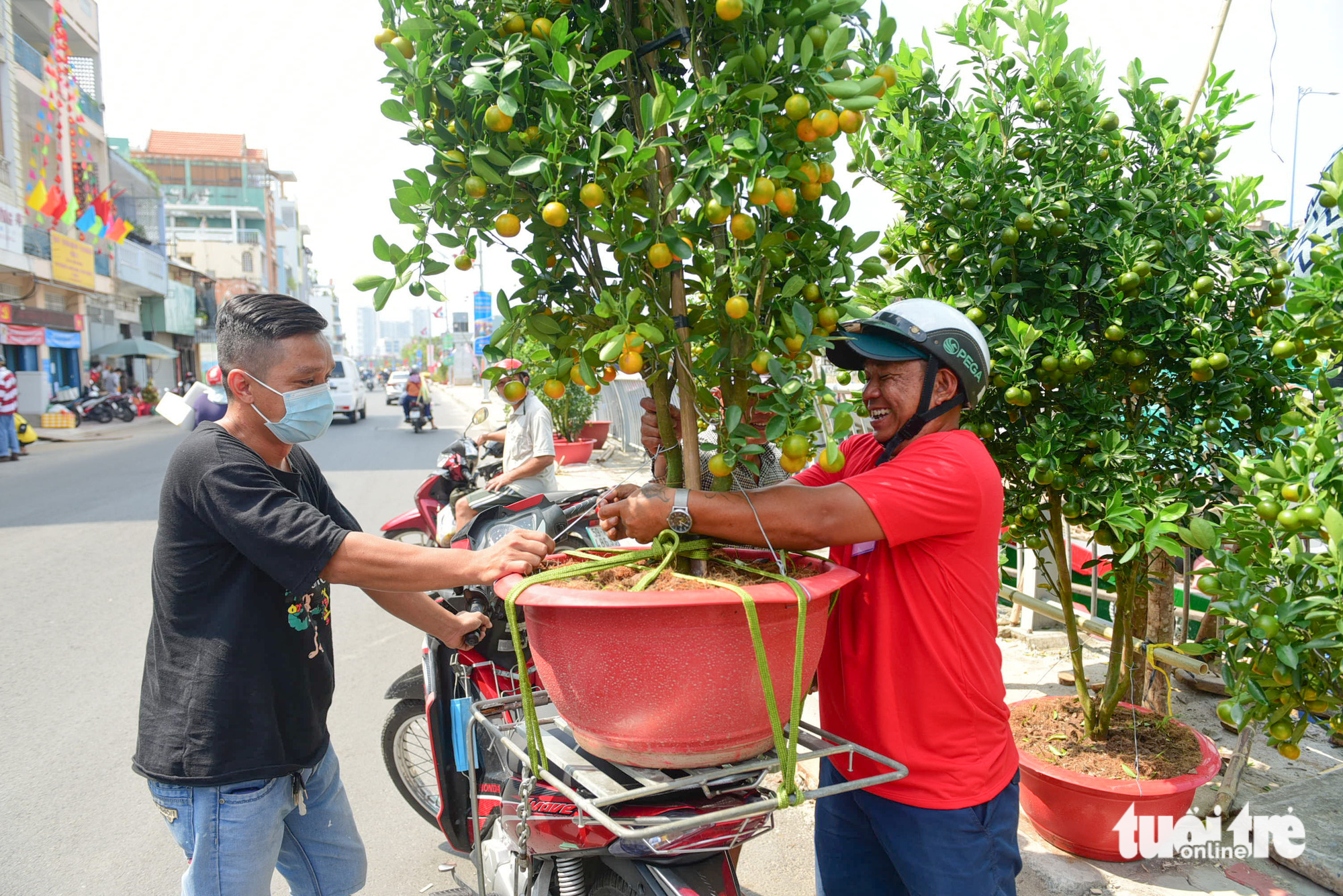 Chạy dọc Bến Bình Đông những ngày này, người dân sẽ dễ dàng nhìn thấy sắc vàng của hoa mai, đỏ của hoa giấy, hay màu xanh của những quả tắc mọng nước… được thương lái mang lên TP.HCM bày bán.