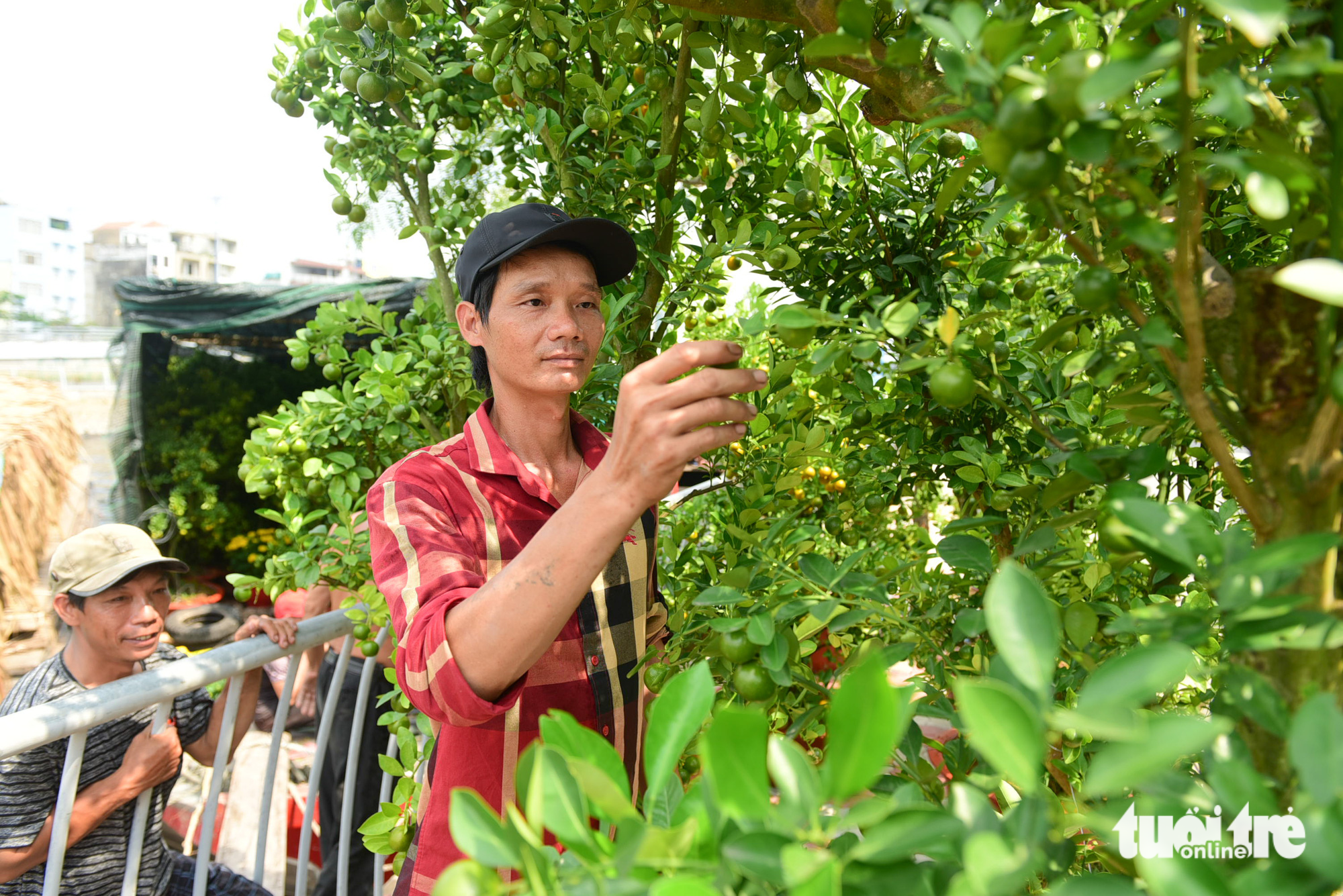 Anh Nguyễn Văn Tèo mang 300 chậu tắc lên bán dịp Tết này, trái anh chọn những quả xanh để khách chơi lâu - Ảnh: NGỌC PHƯỢNG