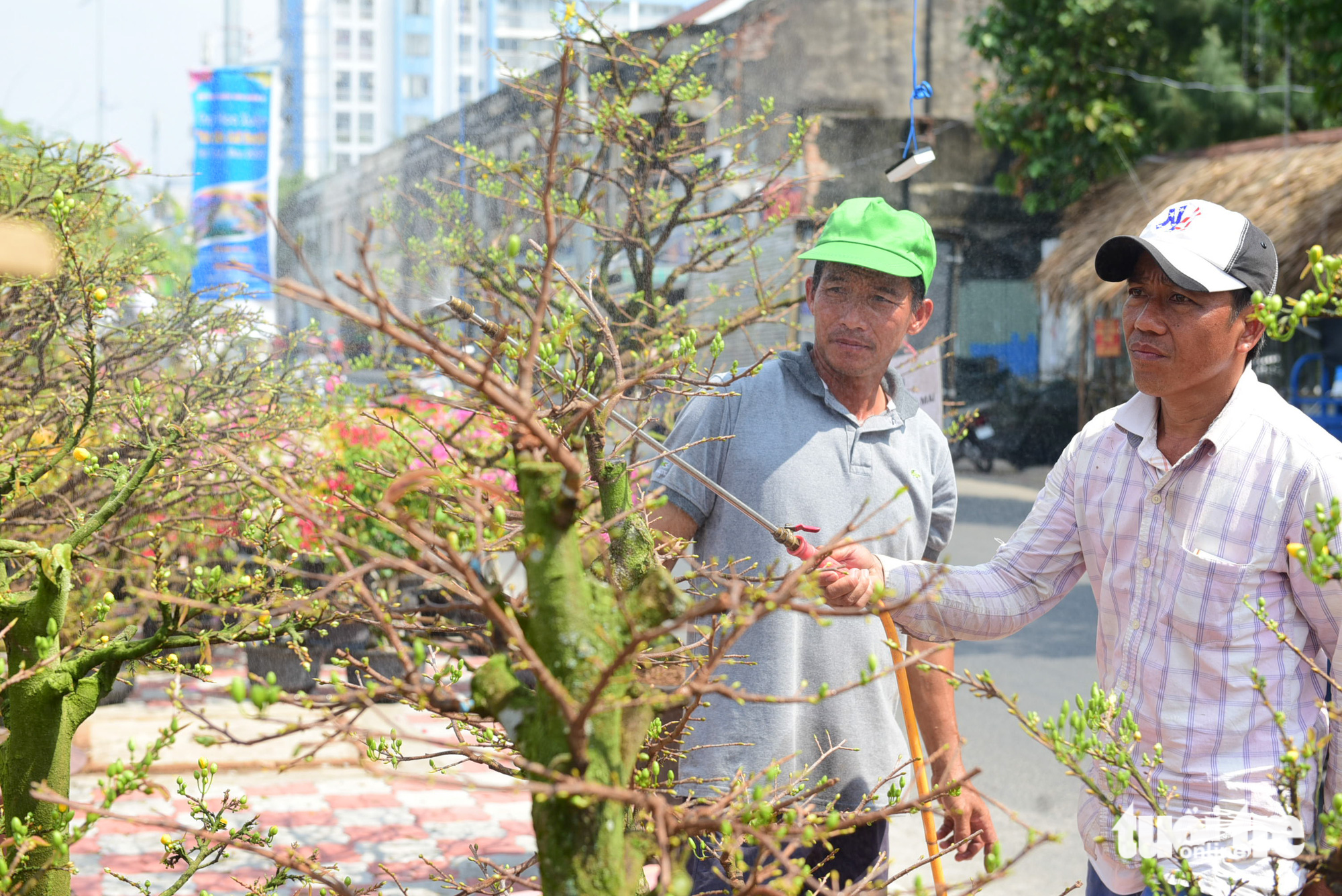 Anh Nguyễn Văn Sơn (nhà vườn Bến Tre, bên trái) cho biết mang 100 chậu mai vừa bán, vừa cho thuê - Ảnh: NGỌC PHƯỢNG