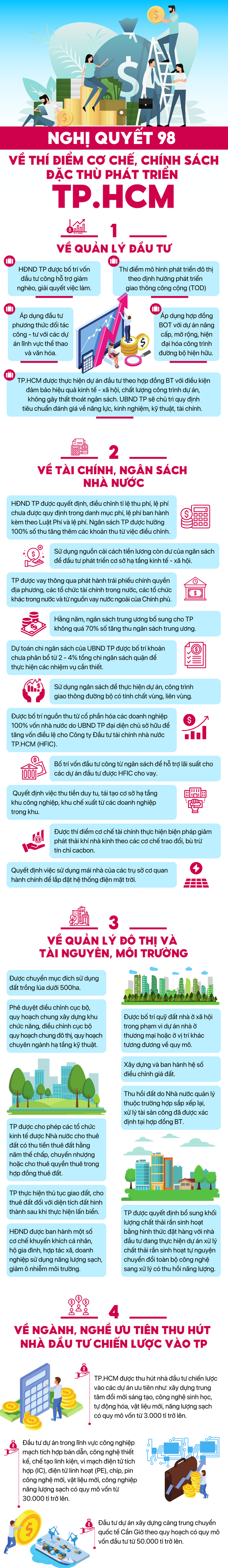 Nghị quyết 98 về thí điểm cơ chế, chính sách đặc thù phát triển TP.HCM - Đồ họa: NGỌC THÀNH