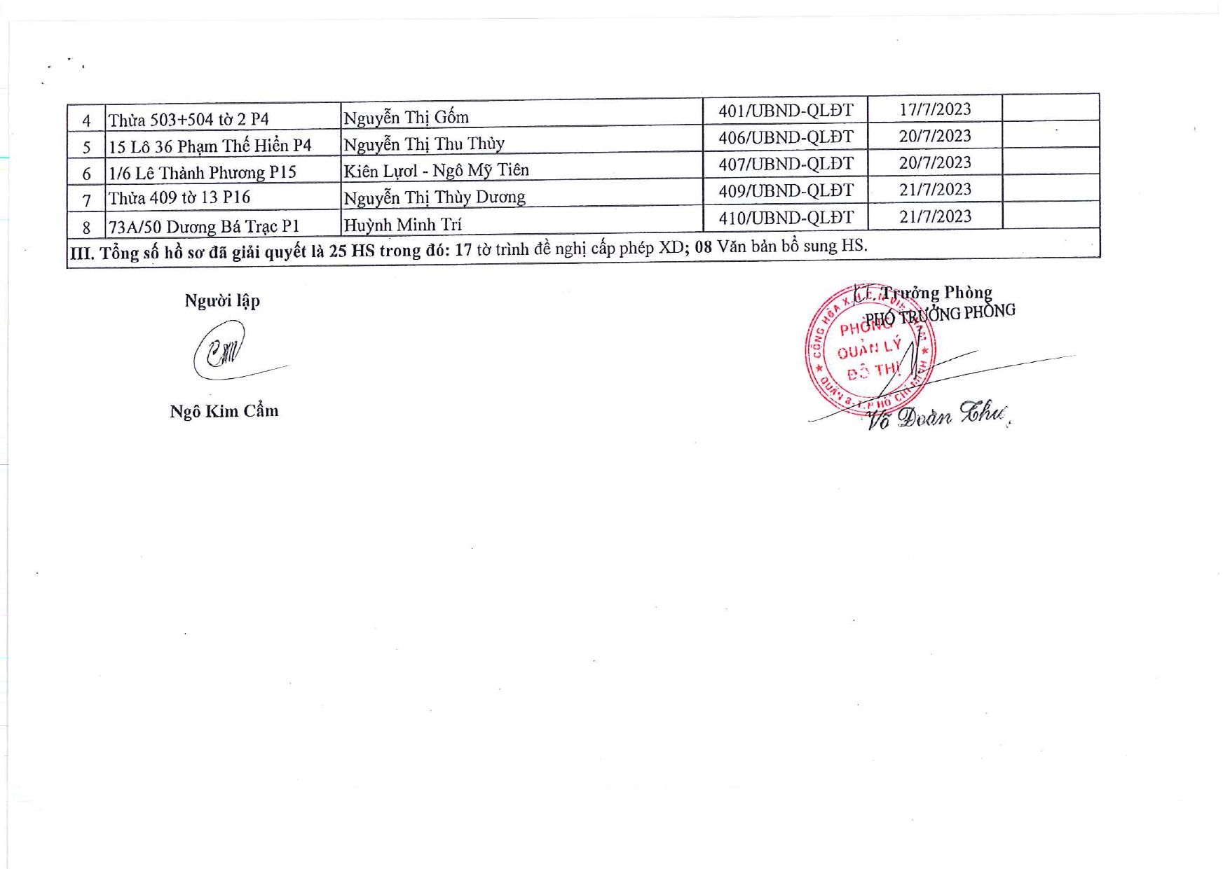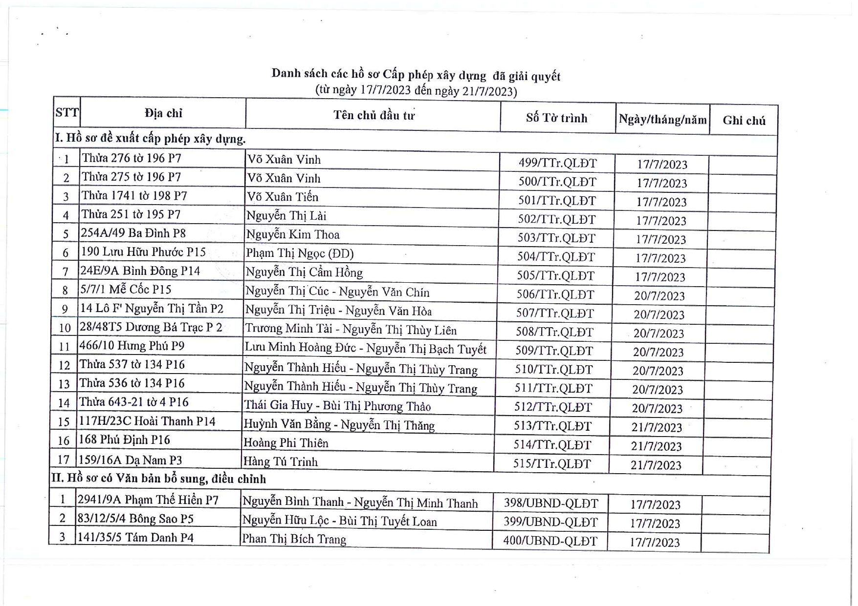 CÔNG KHAI DANH SÁCH HỒ SƠ CẤP PHÉP XÂY DỰNG ĐÃ ĐƯỢC GIẢI QUYẾT TRONG TUẦN TỪ 17/7/2023 ĐẾN 23/7/2023