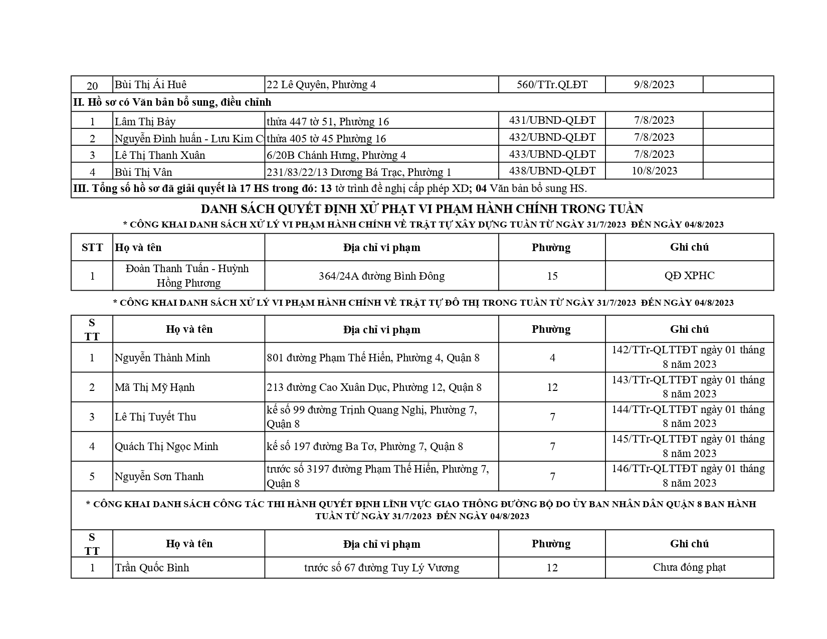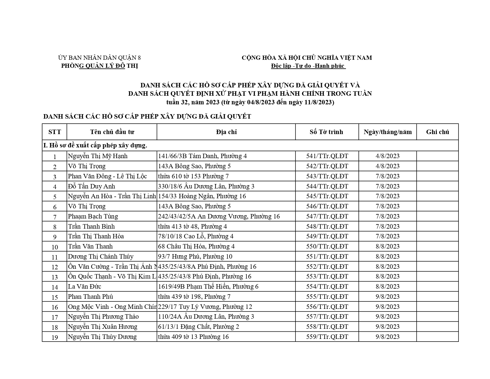 CÔNG KHAI DANH SÁCH HỒ SƠ CẤP PHÉP XÂY DỰNG ĐÃ ĐƯỢC GIẢI QUYẾT TRONG TUẦN TỪ 04/8/2023 ĐẾN 11/8/2023