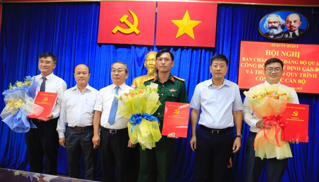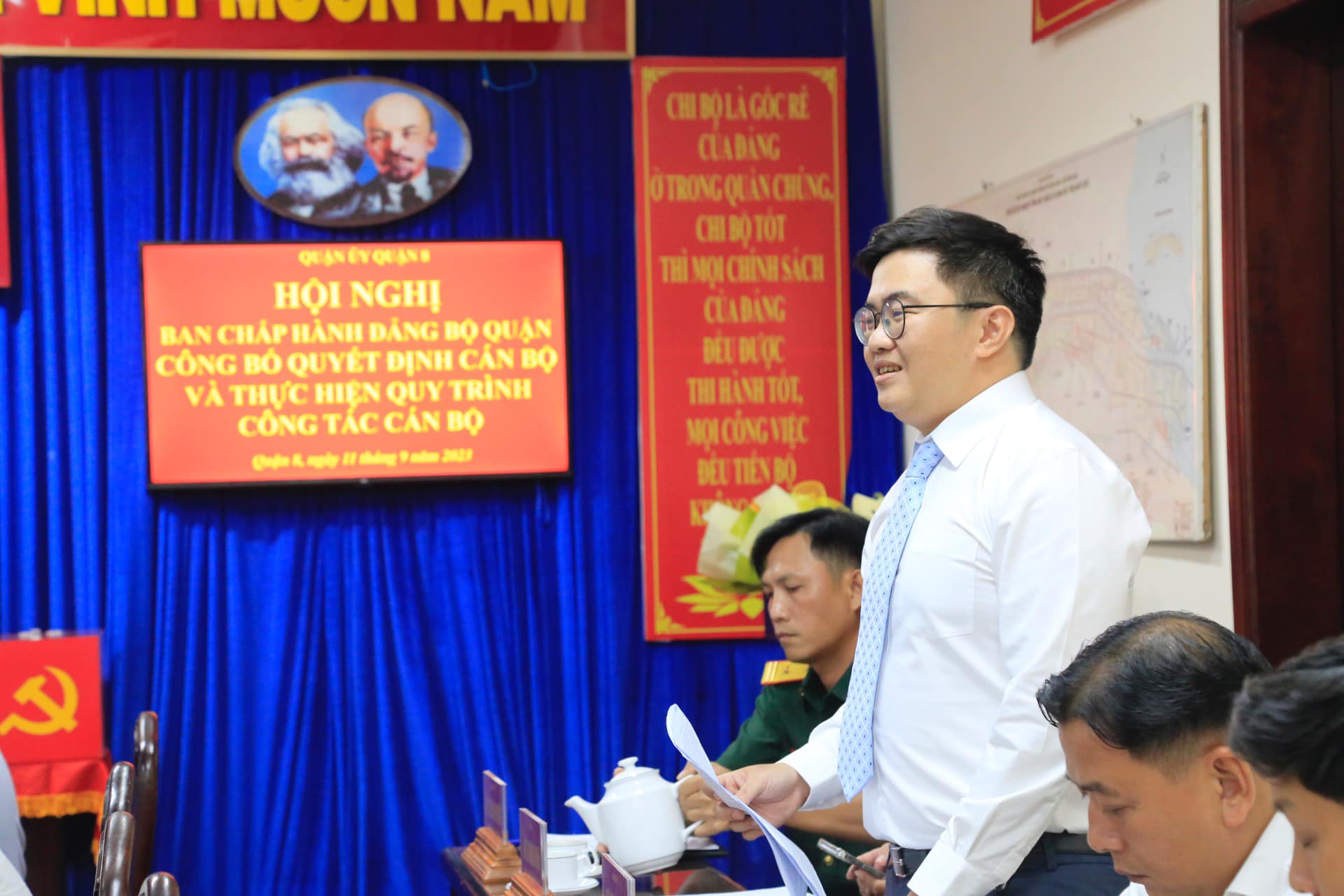 Phát biểu chúc mừng và giao nhiệm vụ, Bí thư Quận ủy Quận 8 Võ Ngọc Quốc Thuận tin tưởng và mong rằng các đồng chí tiếp tục cống hiến, cùng tập thể Đảng bộ quận lãnh đạo thắng Nghị quyết của Đảng bộ quận, thành phố; tiếp tục thực hiện các quy định của Đảng, Kết luận 01-KL/TW về tiếp tục thực hiện Chỉ thị số 05-CT/TW của Bộ Chính Trị về đẩy mạnh học tập và làm theo tư tưởng, đạo đức, phong cách Hồ Chí Minh, luôn rèn luyện, phấn đấu để ngày càng tiến bộ trong công tác, góp sức đưa quận nhà ngày càng phát triển.