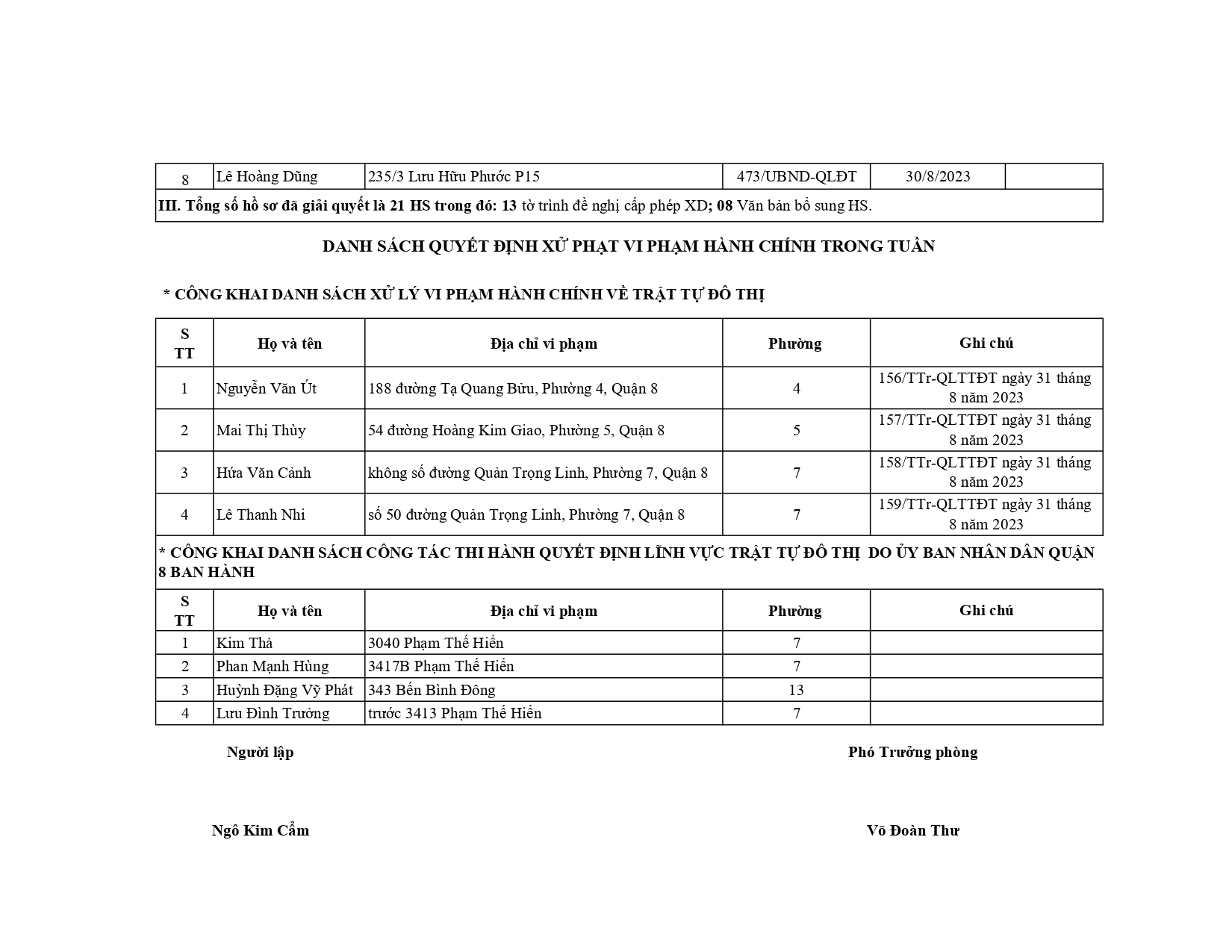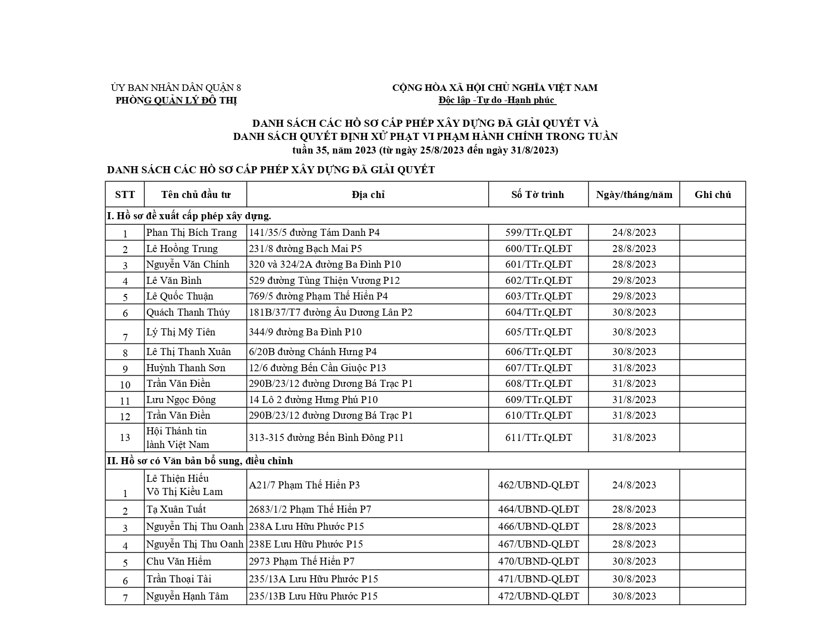 CÔNG KHAI DANH SÁCH HỒ SƠ CẤP PHÉP XÂY DỰNG ĐÃ ĐƯỢC GIẢI QUYẾT TRONG TUẦN TỪ 25/8/2023 ĐẾN 31/8/2023