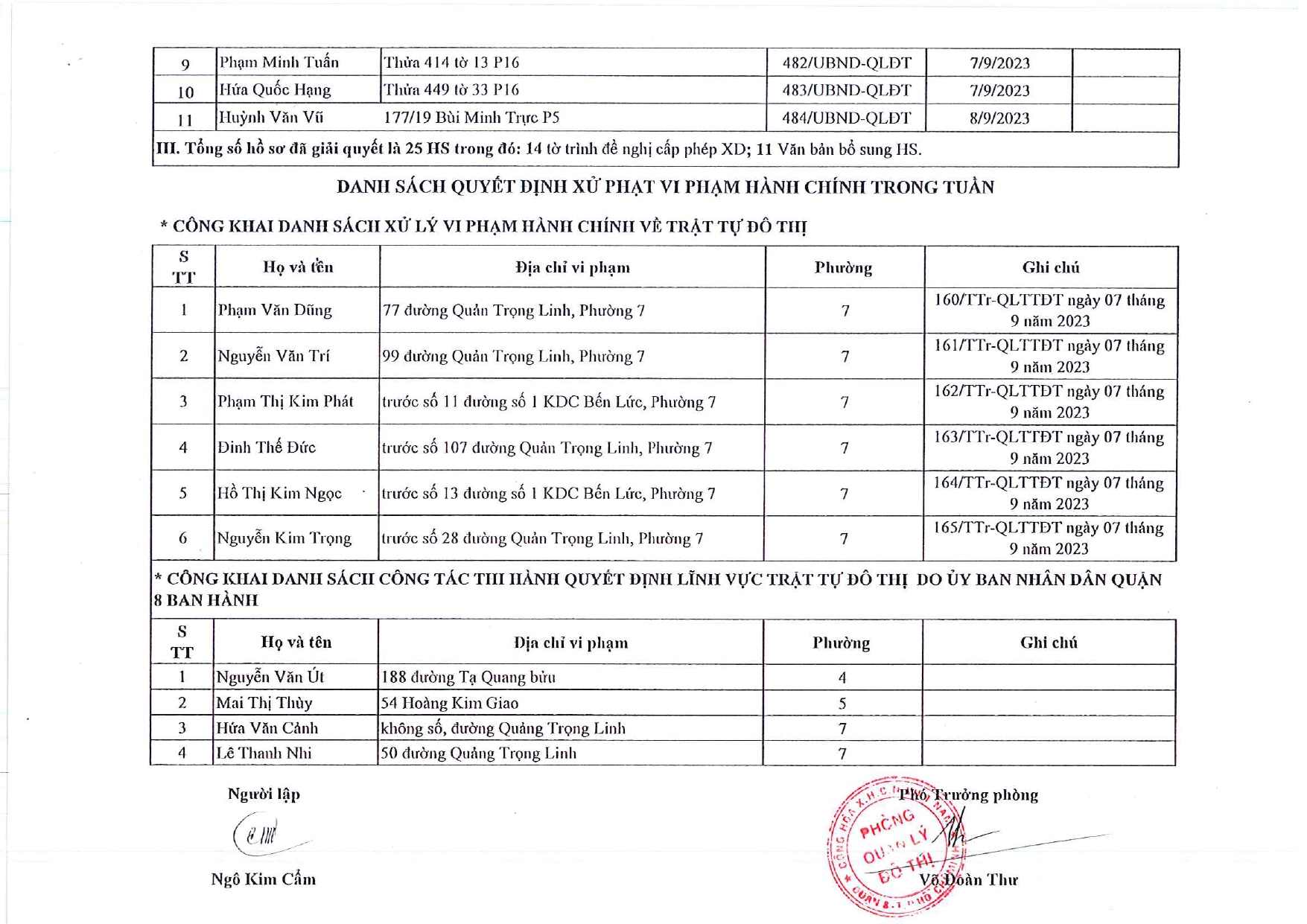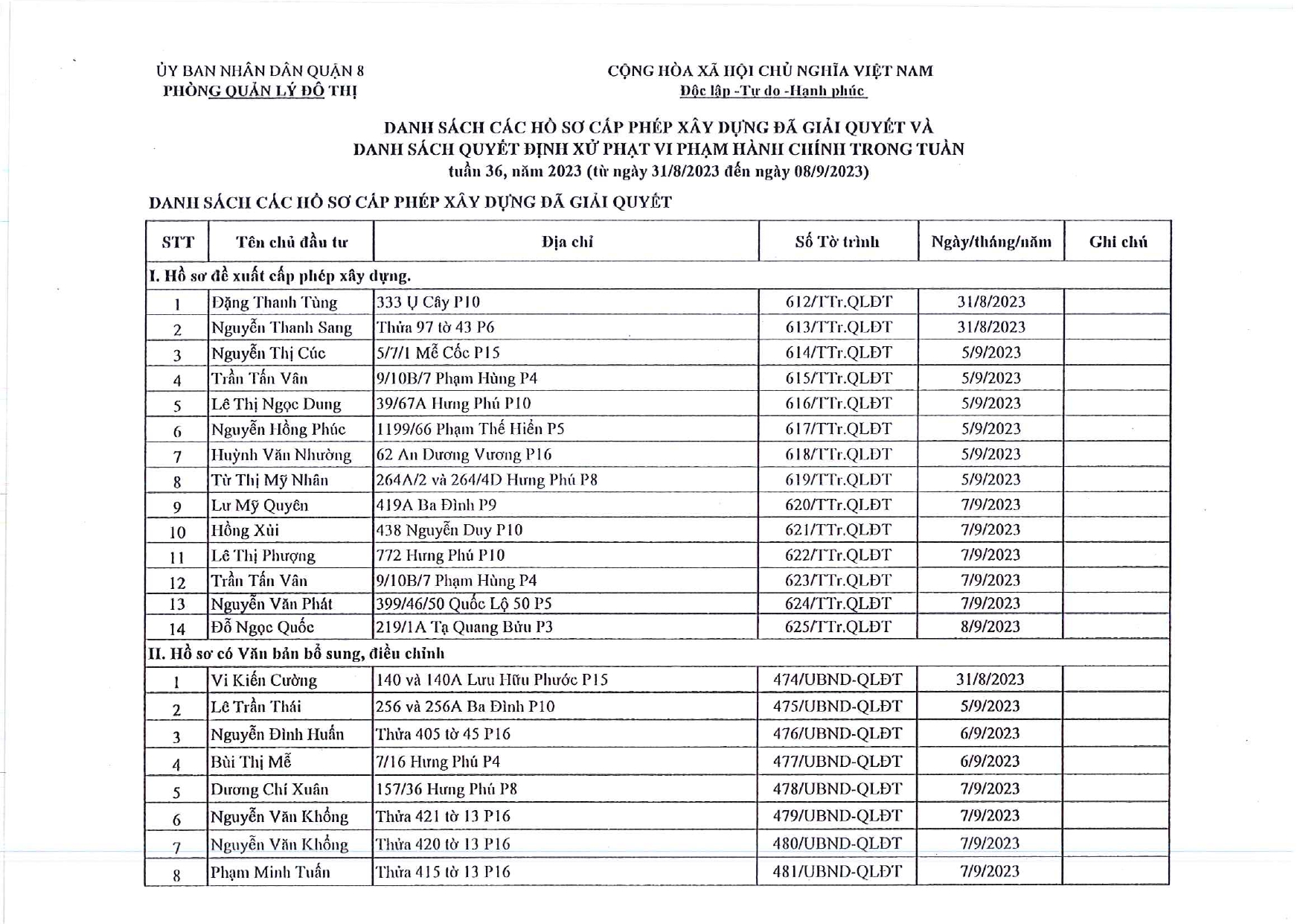 CÔNG KHAI DANH SÁCH HỒ SƠ CẤP PHÉP XÂY DỰNG ĐÃ ĐƯỢC GIẢI QUYẾT TRONG TUẦN TỪ 31/8/2023 ĐẾN 08/9/2023