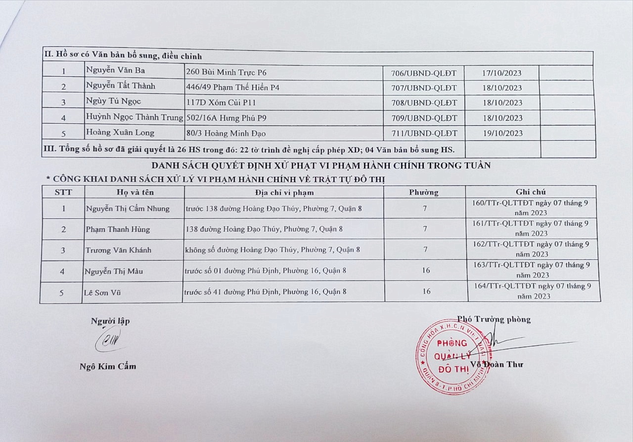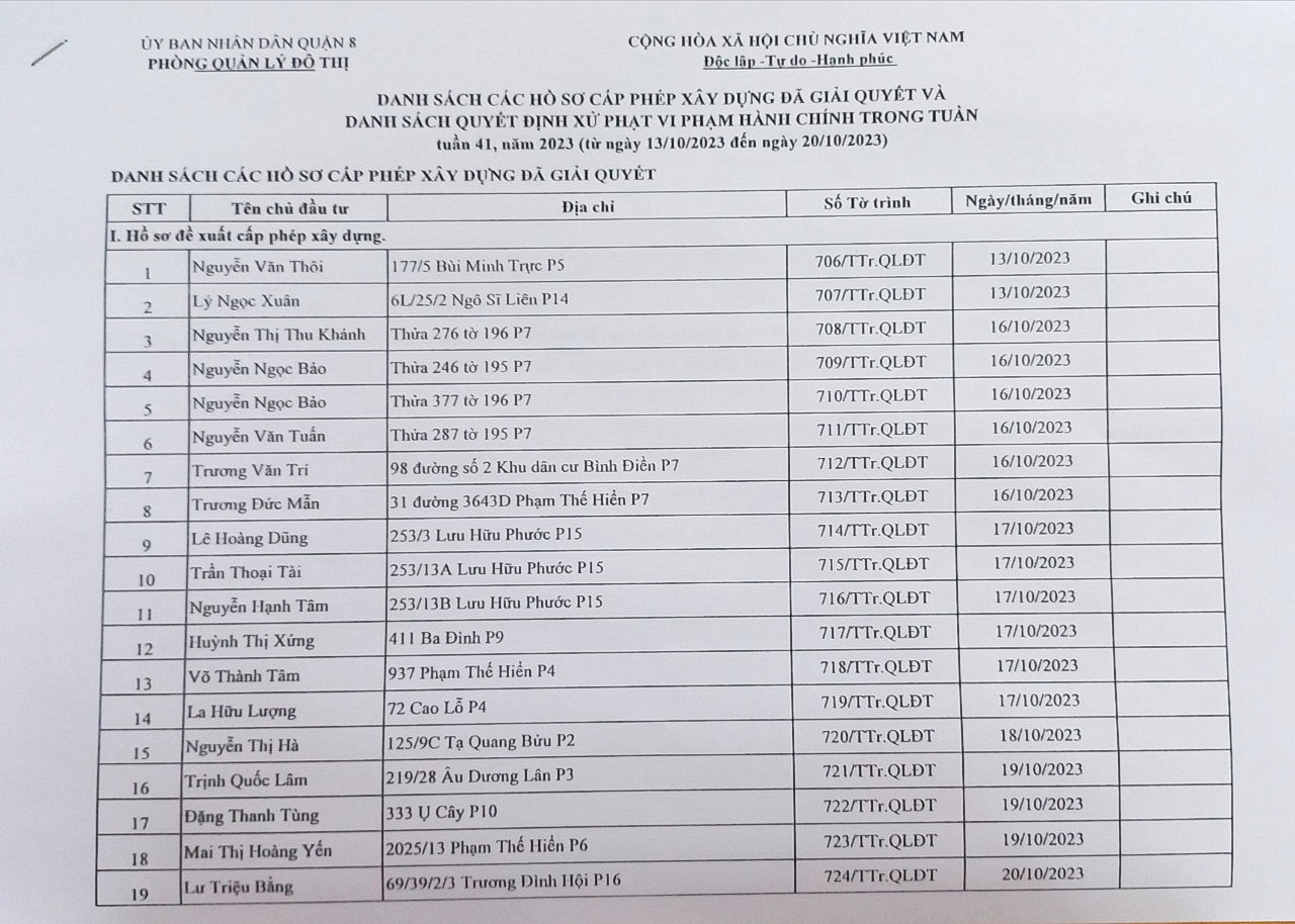 CÔNG KHAI DANH SÁCH HỒ SƠ CẤP PHÉP XÂY DỰNG ĐÃ ĐƯỢC GIẢI QUYẾT TRONG TUẦN TỪ 13/10/2023 ĐẾN 20/10/2023