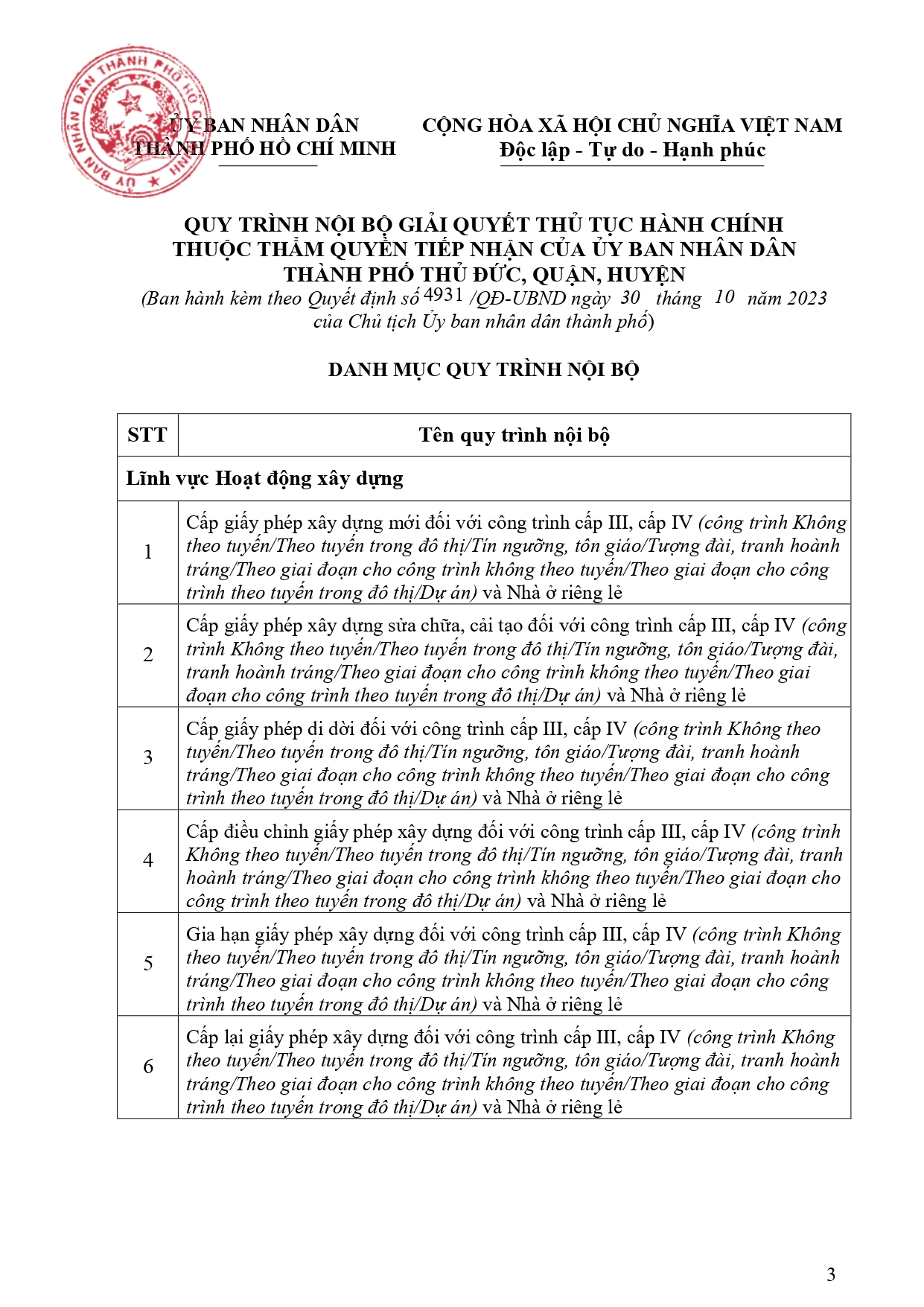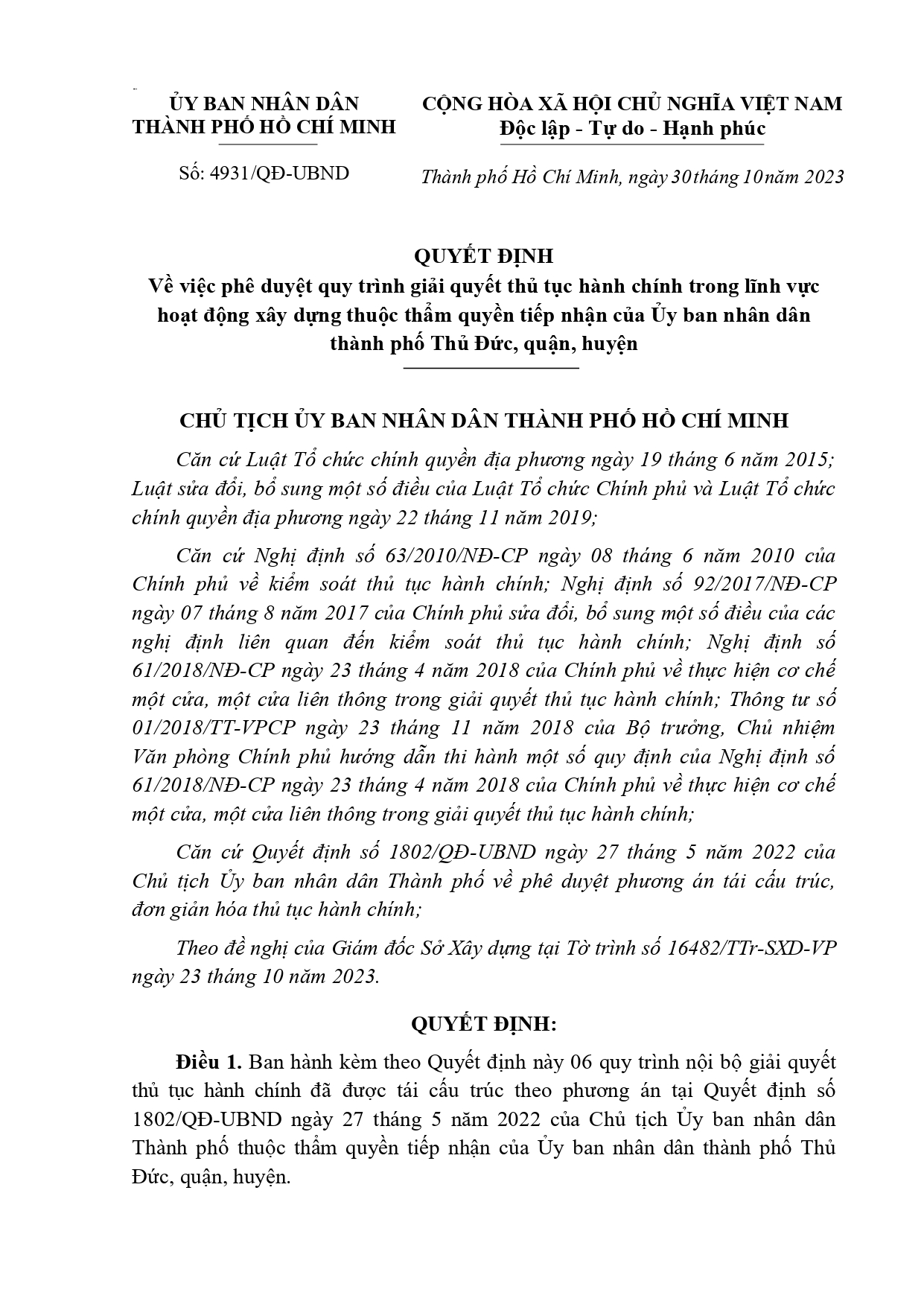 Phê duyệt quy trình giải quyết thủ tục hành chính trong lĩnh vực hoạt động xây dựng thuộc thẩm quyền tiếp nhận của Ủy ban nhân dân thành phố Thủ Đức, quận, huyện