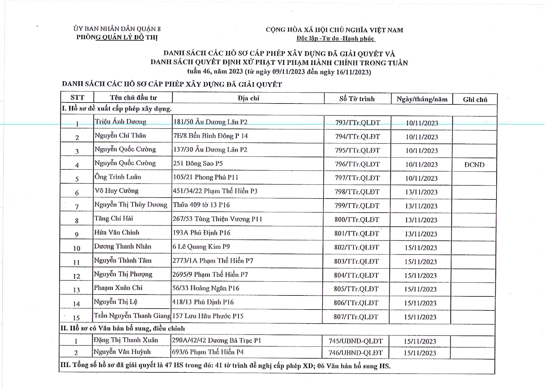 CÔNG KHAI DANH SÁCH HỒ SƠ CẤP PHÉP XÂY DỰNG ĐÃ ĐƯỢC GIẢI QUYẾT TRONG TUẦN TỪ 09/11/2023 ĐẾN 16/11/2023